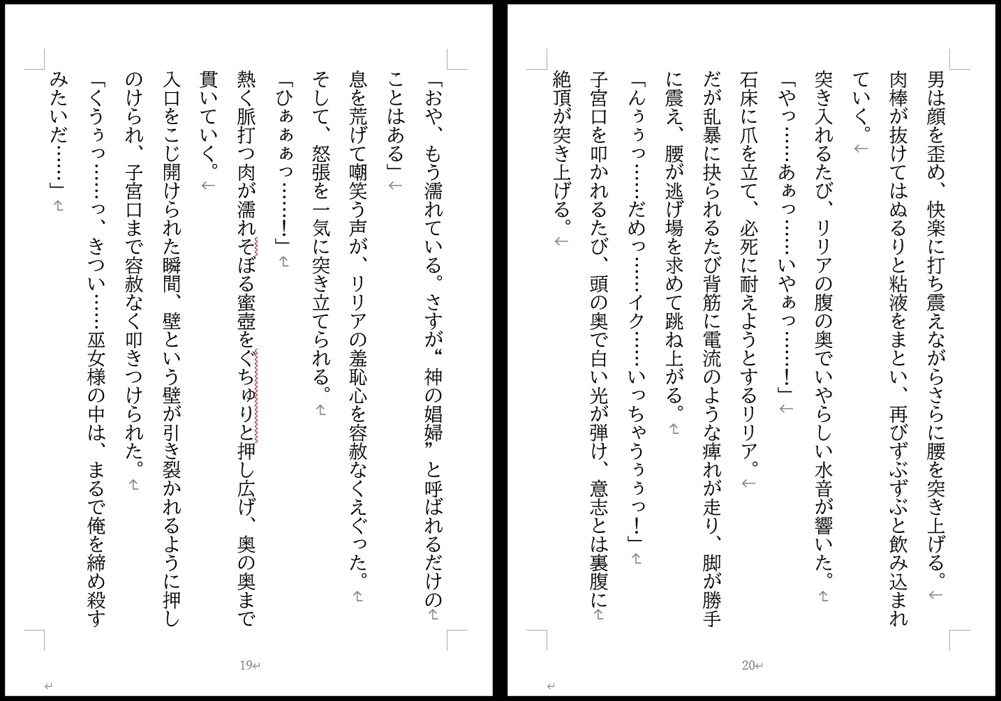 黒髪黒瞳を持つ巫女リリアは、絶頂を重ねるたびに男へ力を与える宿命を背負う。毎夜「聖なる儀式」と称され抱かれ続け、民には娼婦と嘲られ、愛する騎士ユリウスにさえ拒絶される。だが彼女を得た英雄は次第に狂気に囚われ、巫女は涙と快楽の狭間で“力の源”として縛られていく──背徳と絶望のファンタジー官能譚。