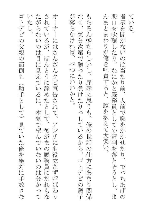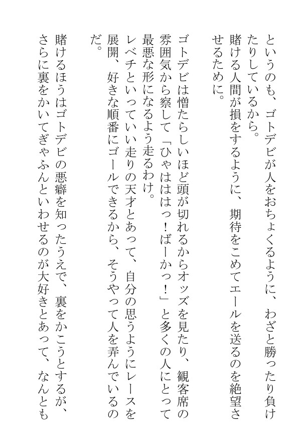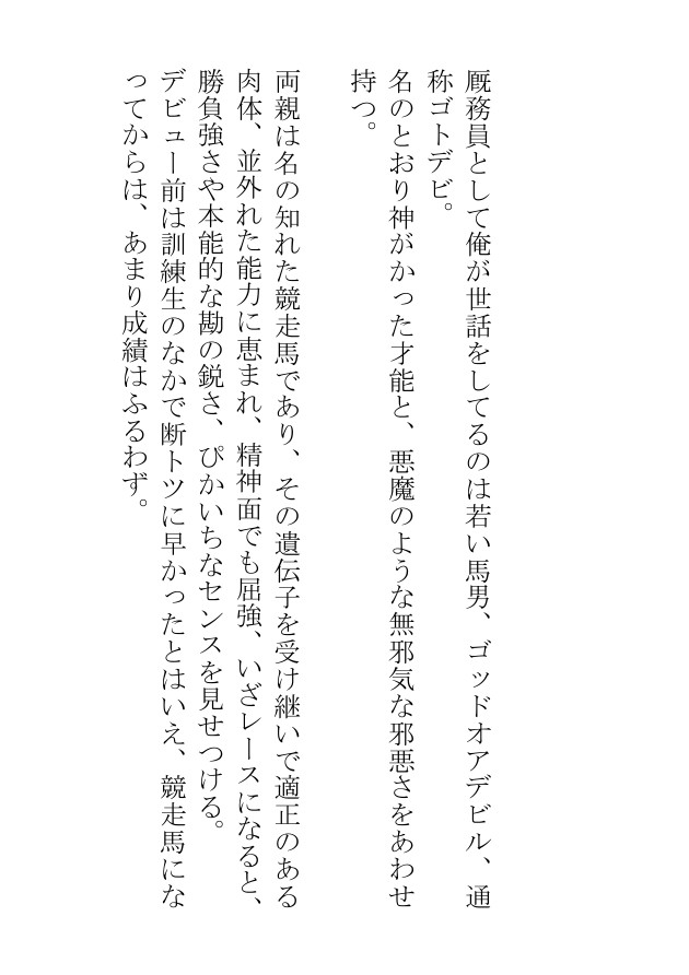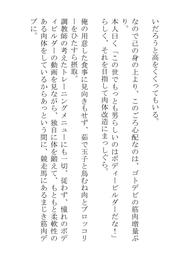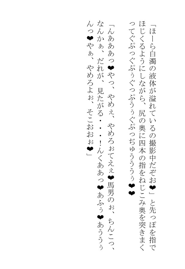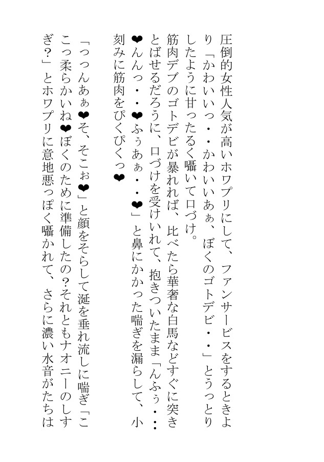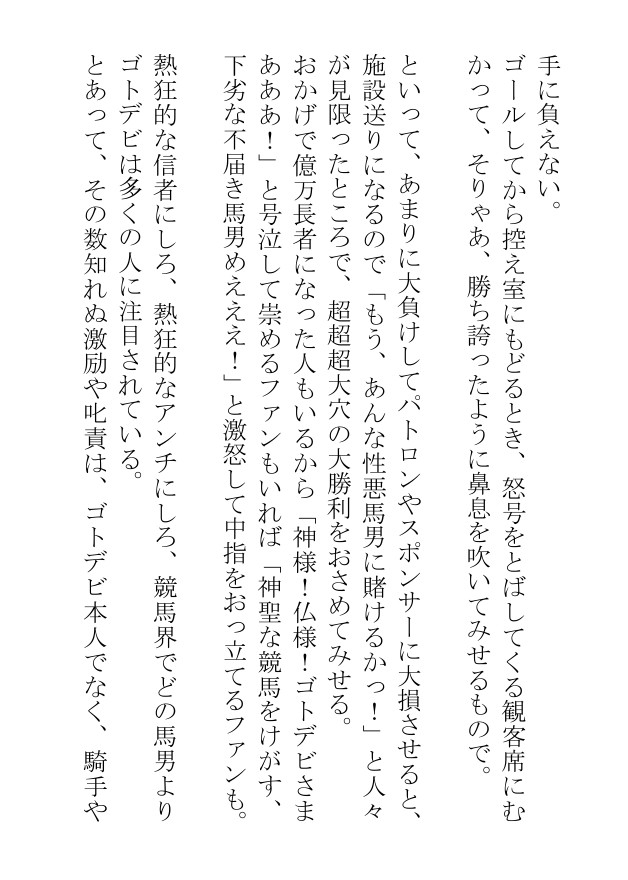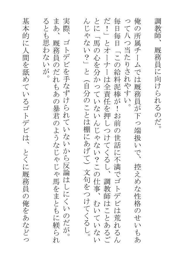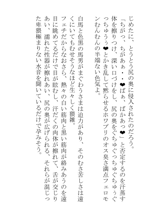競走馬としては、ありえないほど筋肉ブになったギャル男のような馬男が、野郎共に黒光りするわがままボディを貪り食われるBL小説です。