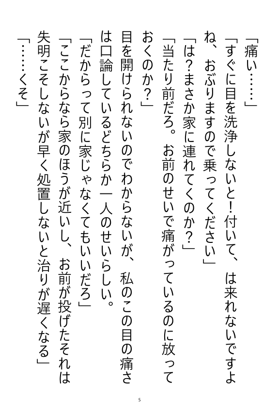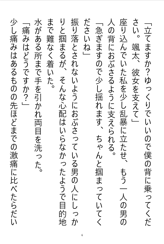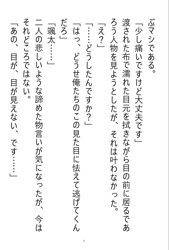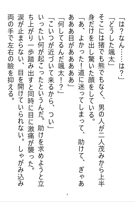 男性たちの家で手当てを受ける主人公だが、目が見えなくなっていることに気が付き治るまで男性たちの家でお世話になることになったが……。