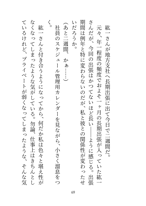 紘一が長期出張に出て二週目、汐里も紘一も互いに触れられなくて悶々とした日々を過ごしていた。