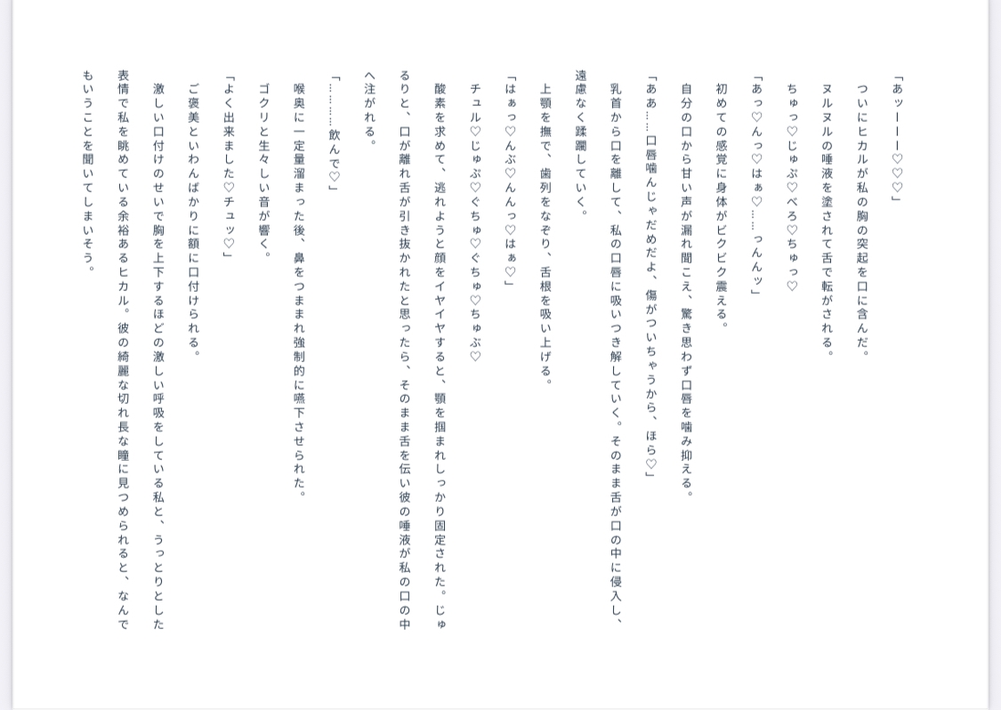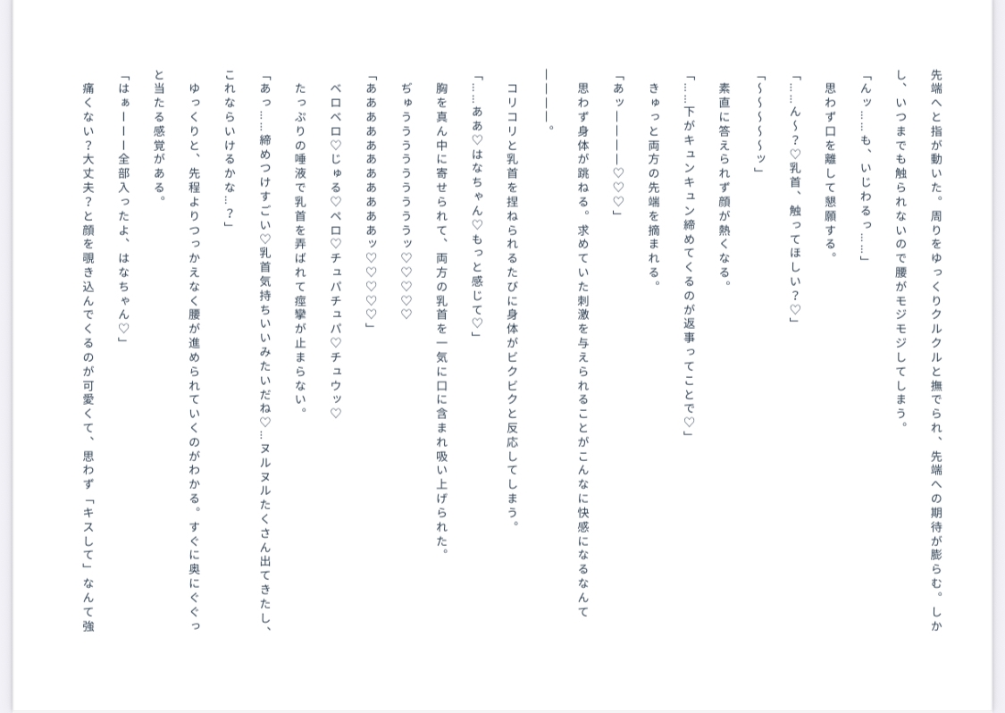 キス・唾液・乳首舐め・クンニ・素股・挿入・中出し・♡セリフ多め