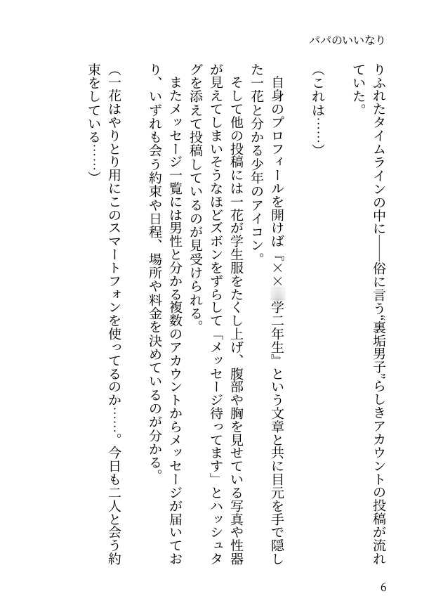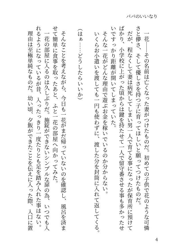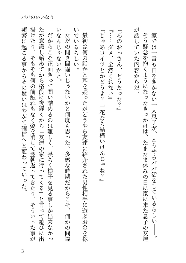 妻を亡くしてから男一人で息子を育てる父親×父親に隠れてパパ活するが埋めれない寂しさを抱く息子、一花。ある事をきっかけに一花は父親を意識するようになり……。