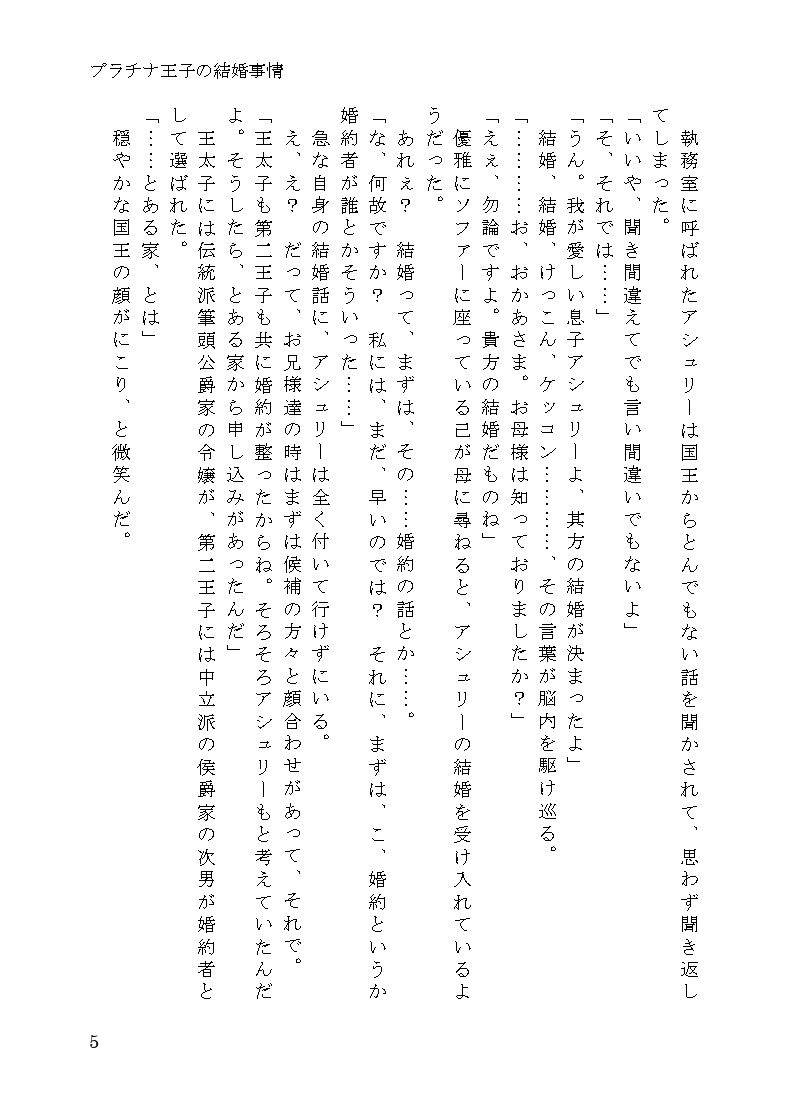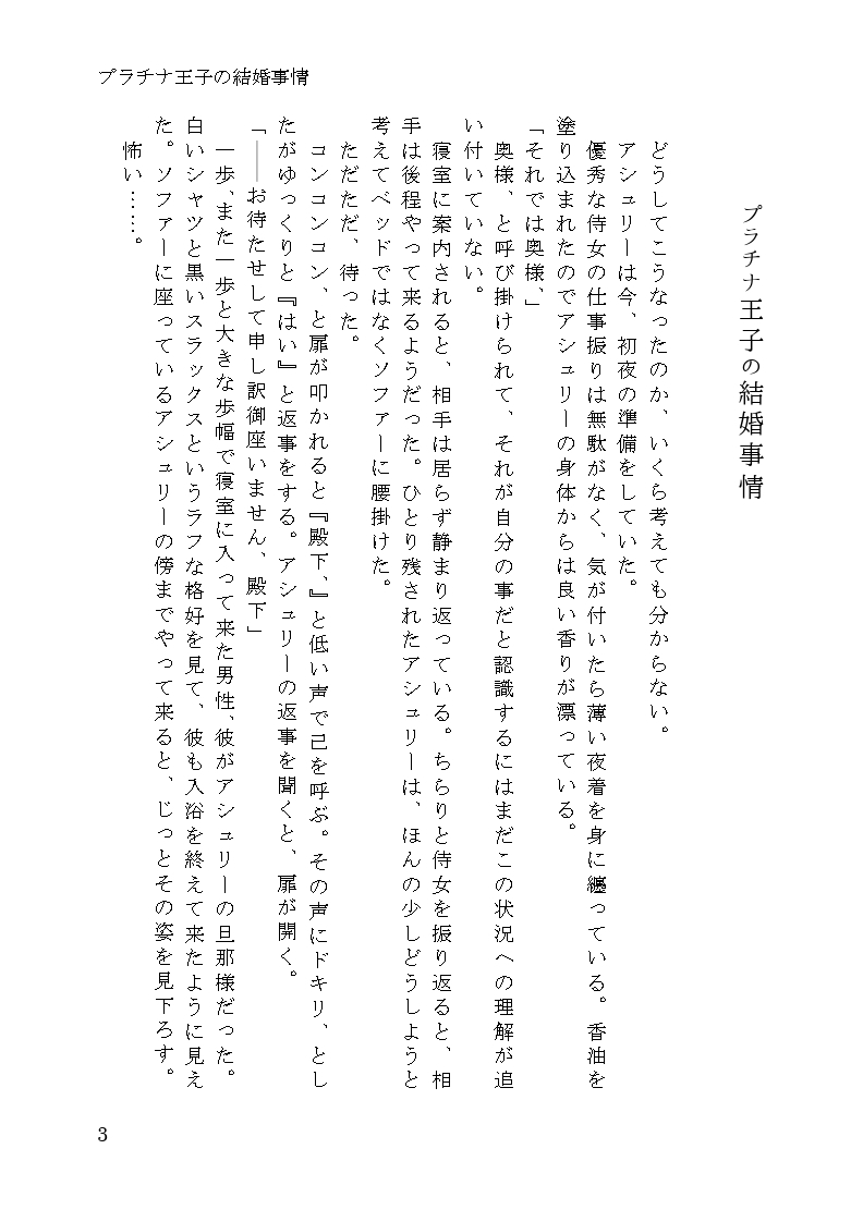 側妃である母親譲りの美しいプラチナブロンドの第三王子アシュリーは、成人を迎えて国王の決定により 革新派筆頭公爵家の令息に嫁ぐ事になった。 伝統派、中立派、革新派、どの派閥も蔑ろに出来ない事は分かっているが、この結婚に前向きに なれなずにいる。 けれど、気が付けば結婚式は終わりもう初夜だった、、、。