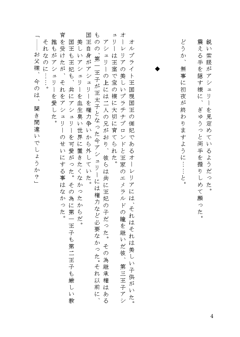 国王の側妃である母親は美しいプラチナブロンドの子爵家令嬢で、国王の寵愛を受けていた。そんな側妃オーレリアの子供である第三王子アシュリーは母親譲りの美しいプラチナブロンドと王家特有のエメラルドの瞳の持ち主だった。
