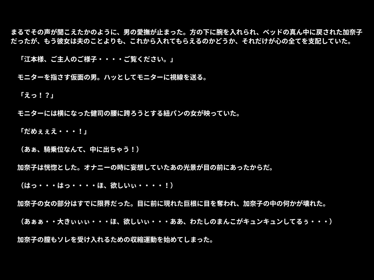 あの淫靡な空間にまさかあの人がいたなんて。口惜しさと嫉妬、絶望と快楽の世界に堕とされる加奈子の体験を、あなたは受け止められますか?