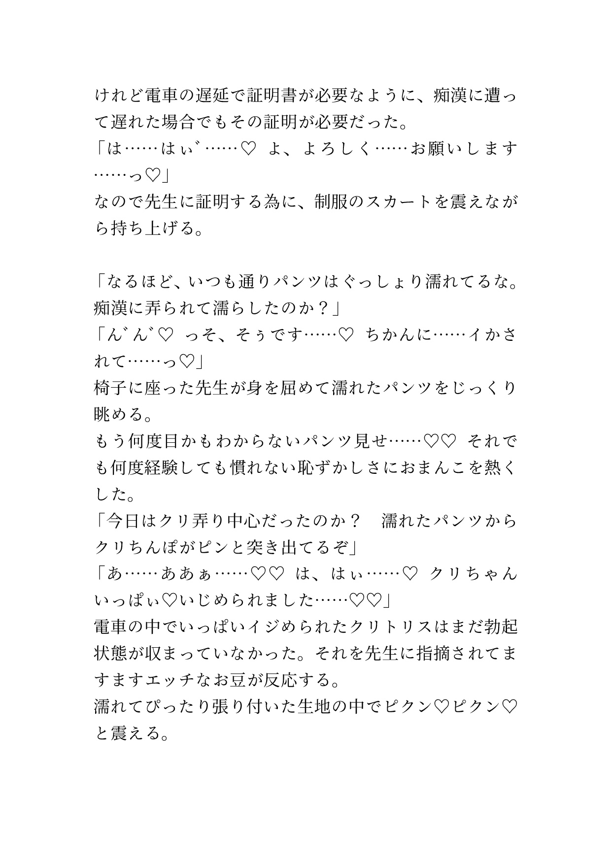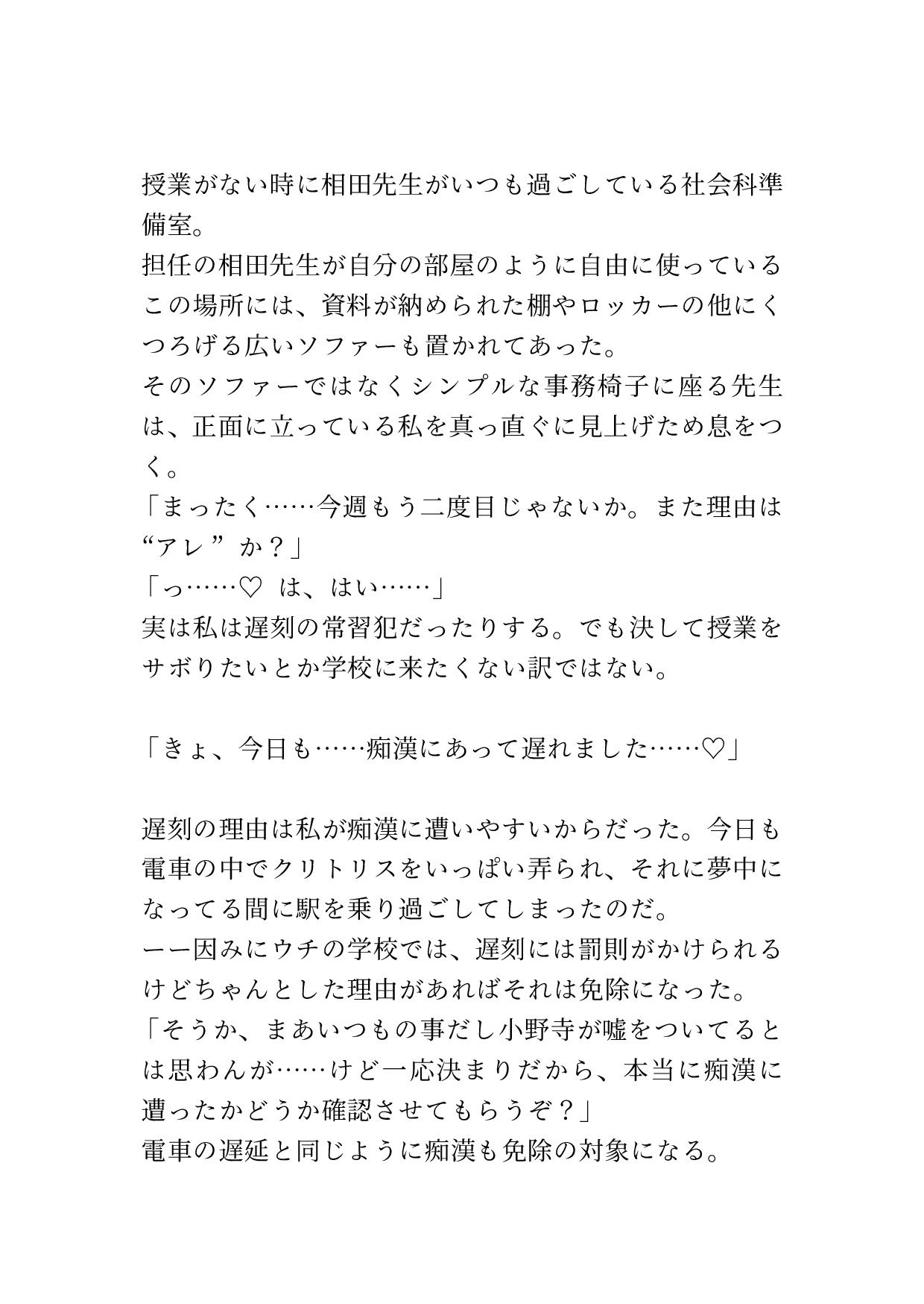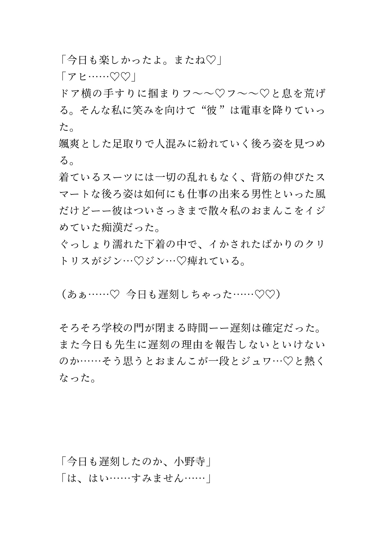 痴○に遭って遅刻した場合、遅刻の罰則の免除を受ける為には担任に痴○された報告をしなければならないという、若干常識改変された世界の話です。