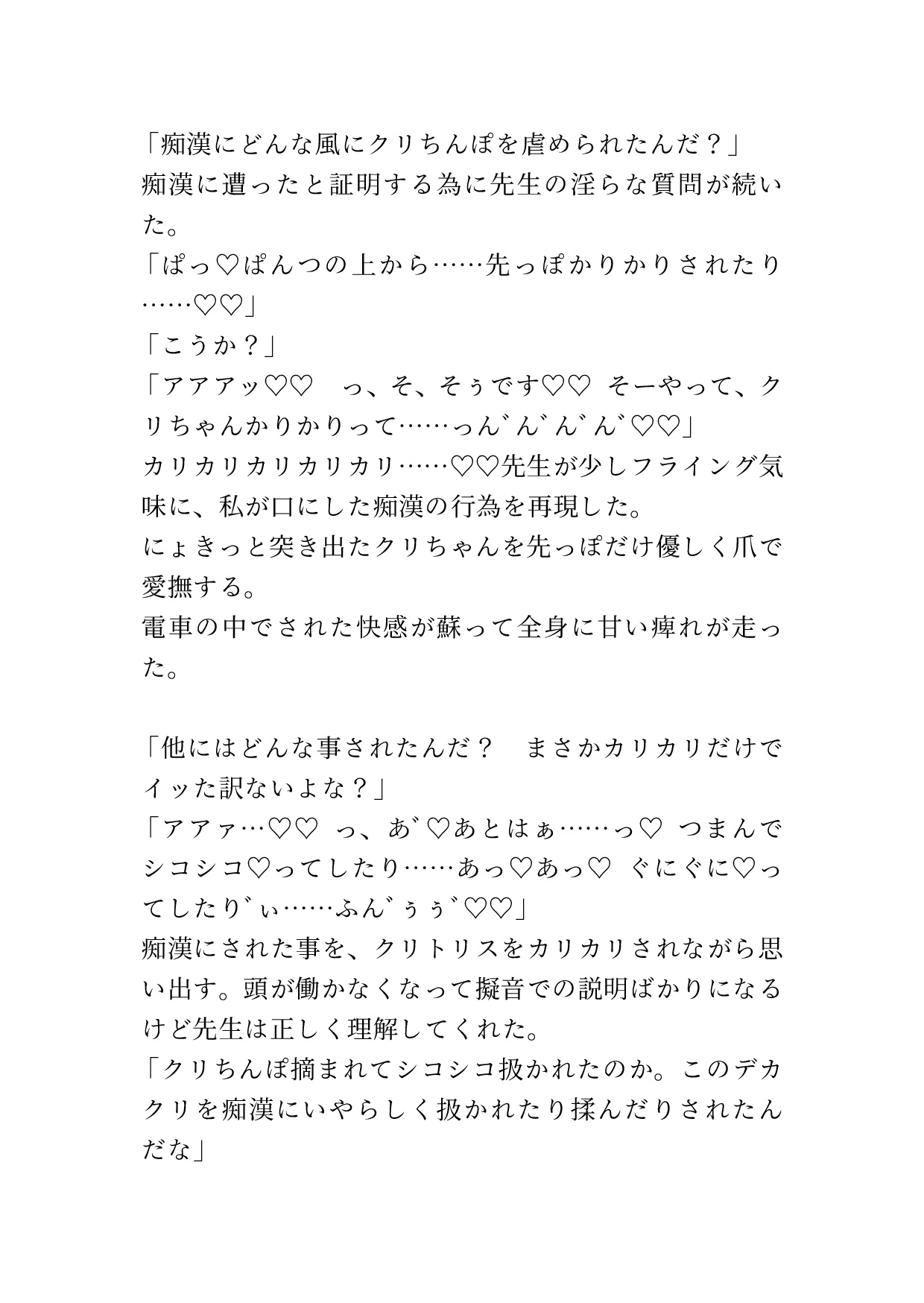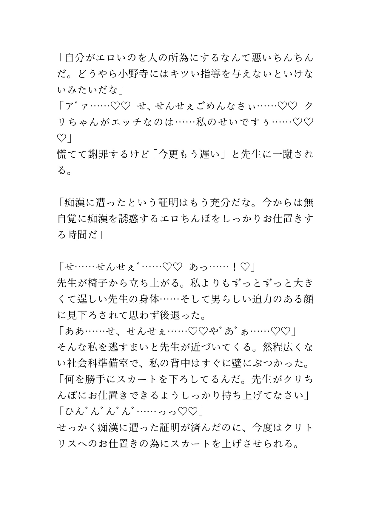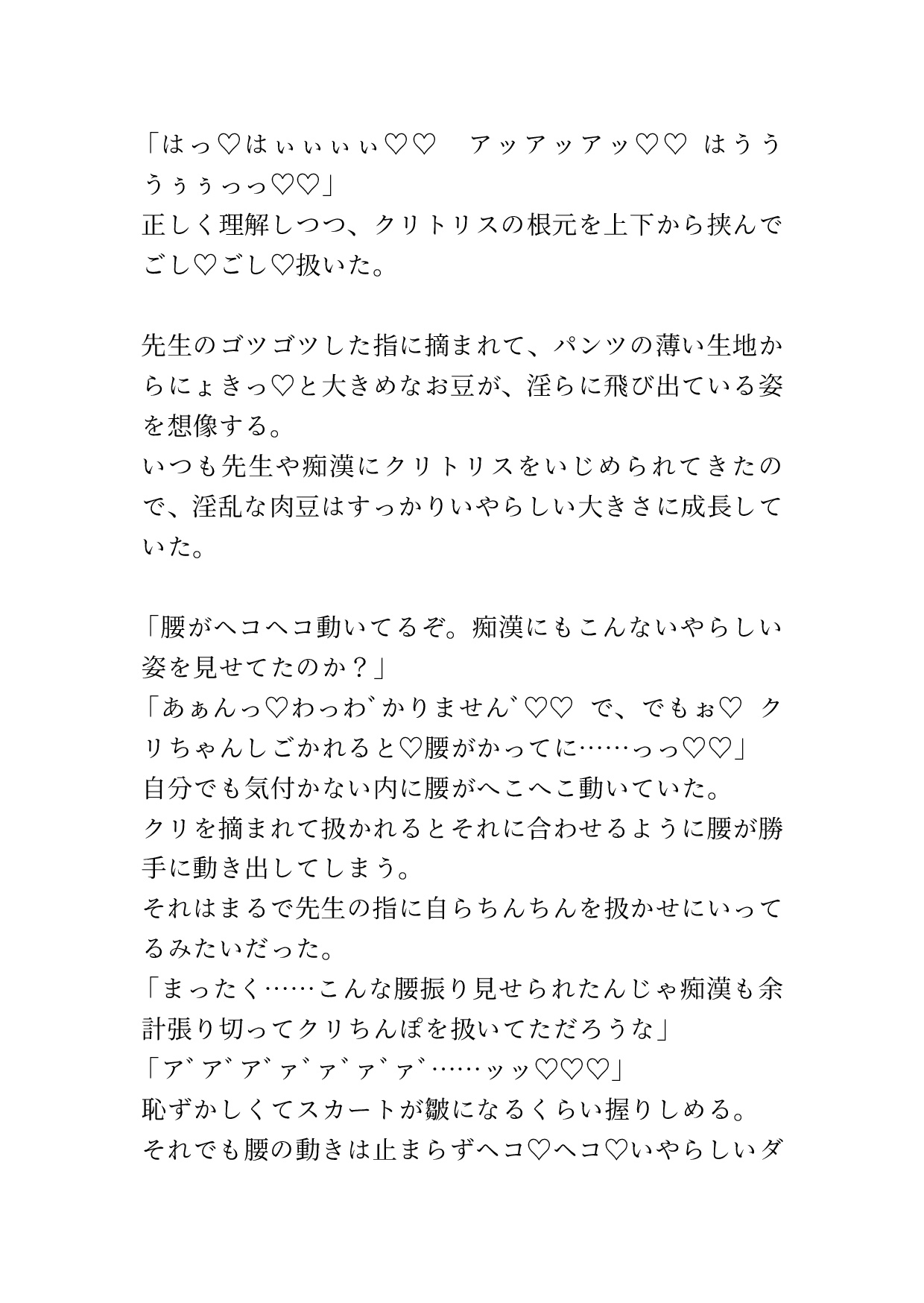 自らスカートを持ち上げ痴○にイかされたぷりっぷりのクリトリスを担任に見せて痴○報告したり、担任の指にクリを押しつけてイッたり、担任のチ○ポにクリを押し潰されてイッてその直後に精子を浴びせられてイッたりしてます。