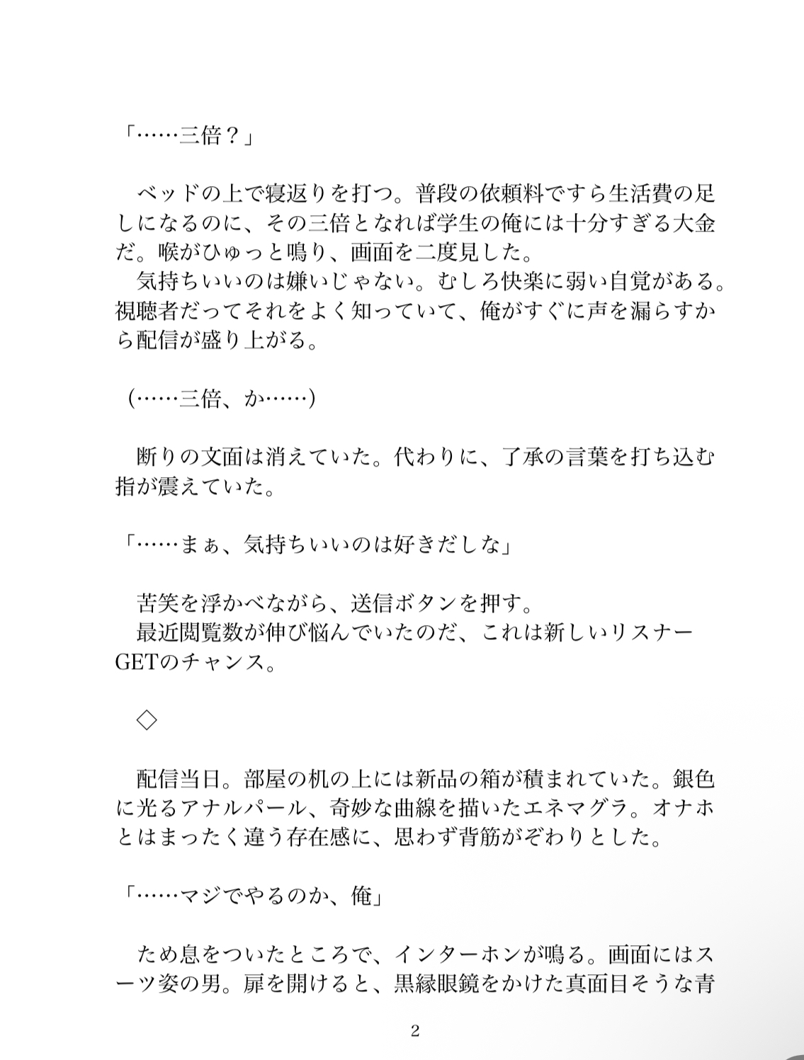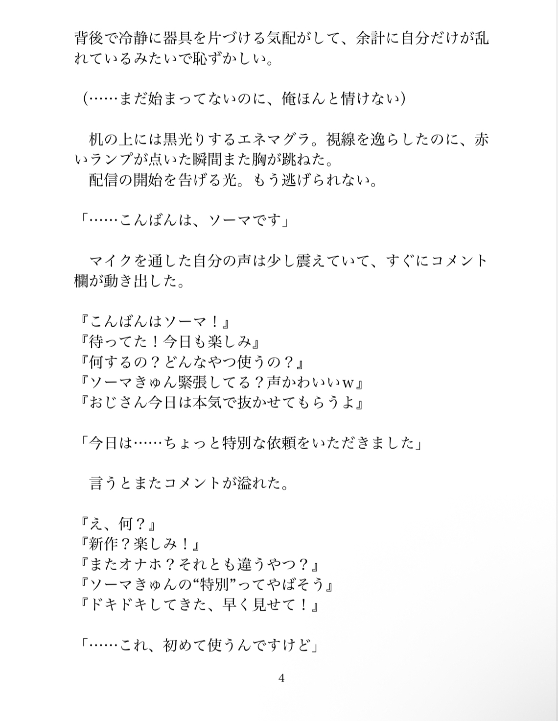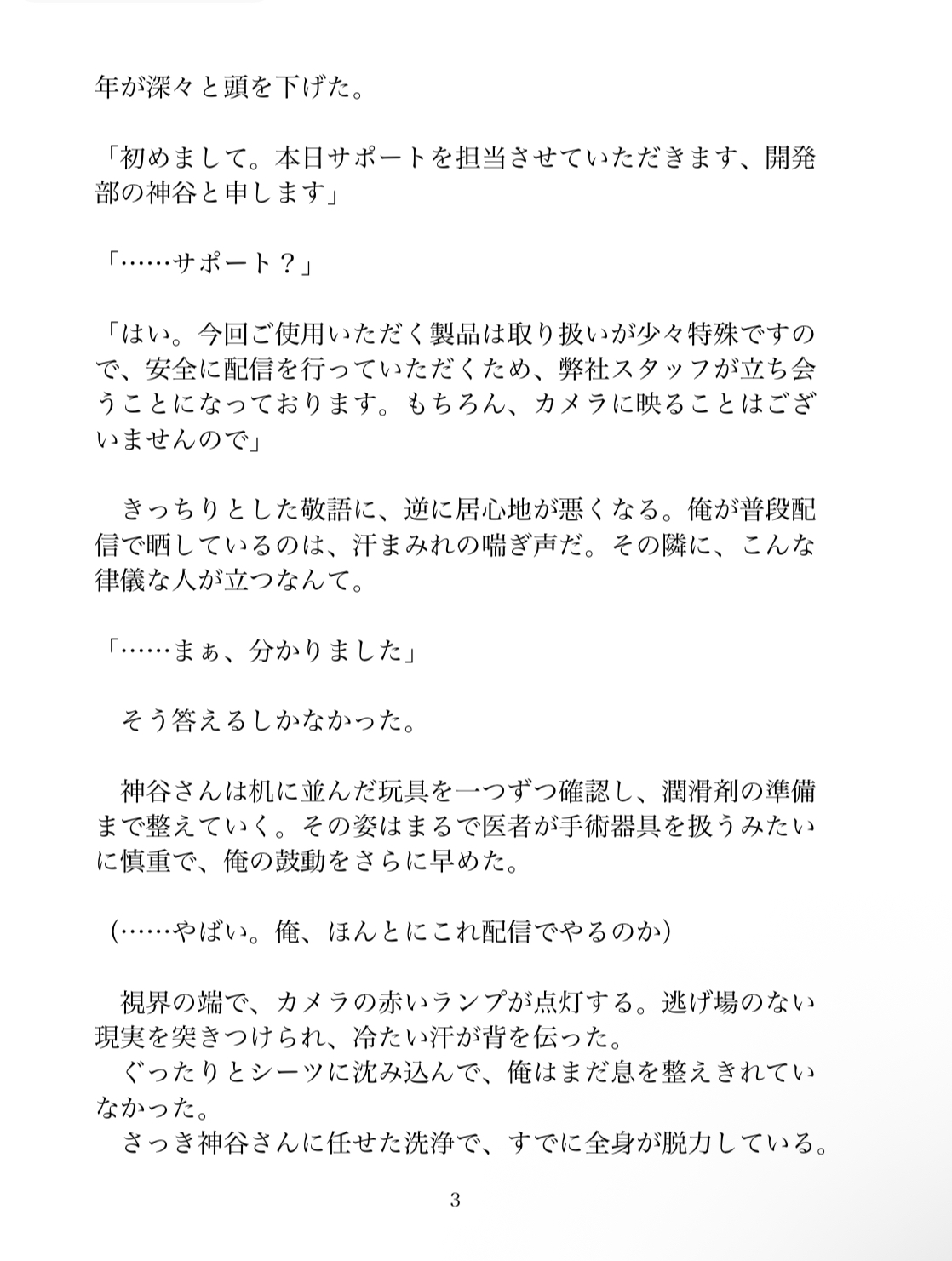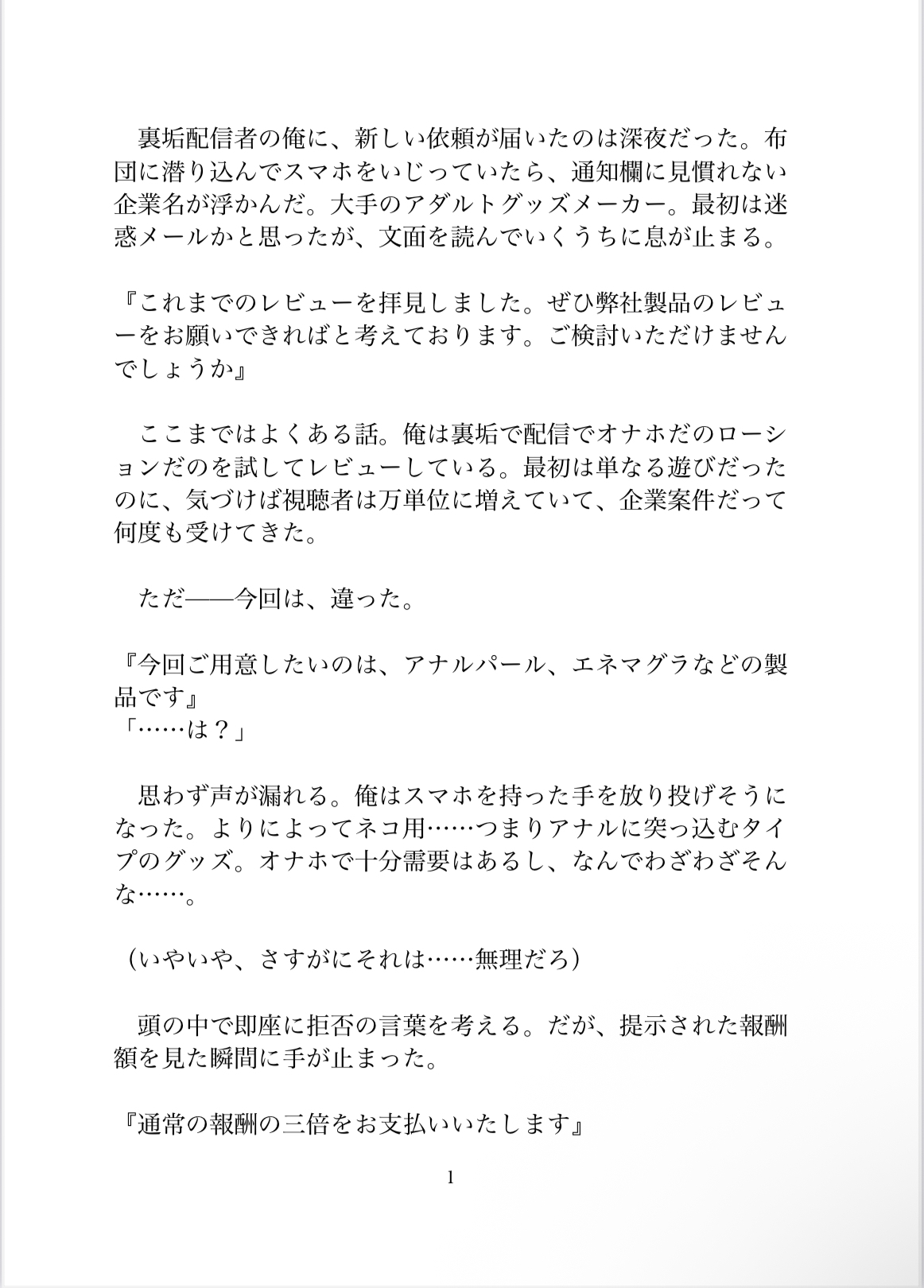 報酬につられてアナルグッズを配信でレビューすることになったソーマは、企業からのサポートとしてついてくれている神谷に手伝って貰いながらアダルトグッズのレビュー配信を行うことになった。
