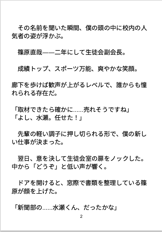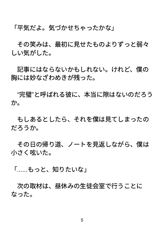 完璧な生徒会副会長を取材する新聞部員が見つけたのは、誰にも見せない「素顔」と、恋の始まりだった。