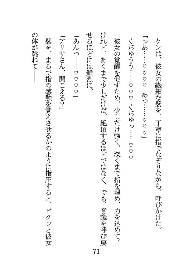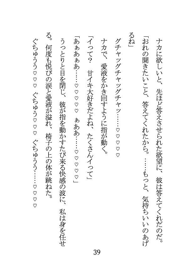 胸揉み、クリ責め、焦らし、手マン、連続絶頂、Gスポット責め(指)、ポルチオ責め(指)、男性視点(ケン寄り三人称)、ポルチオ責め(本番)、潮吹き、中出しなど、たっっぷりつまった2.6万字!