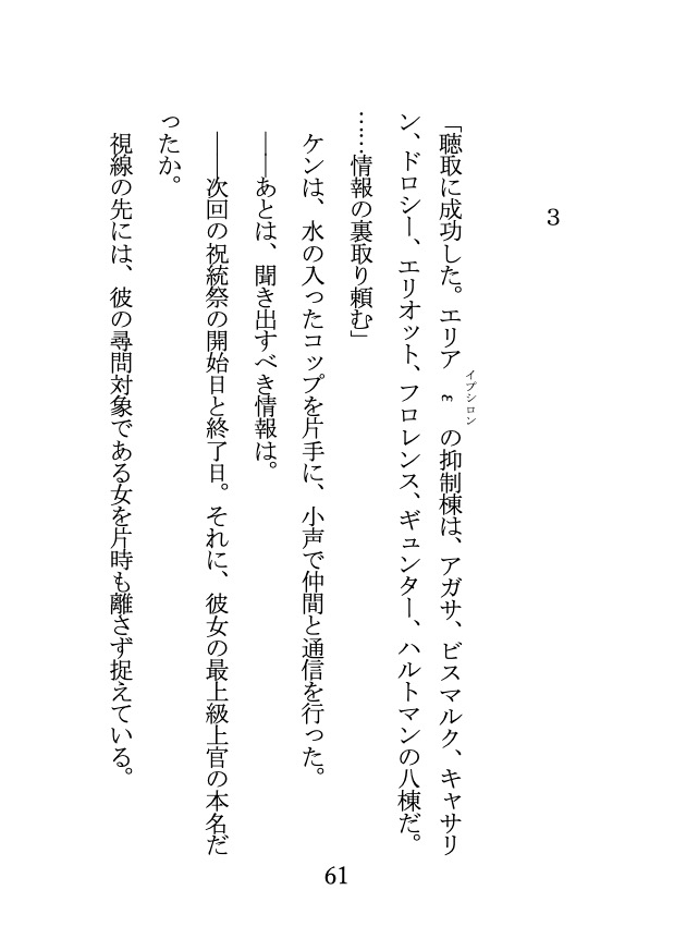 制府と呼ばれる機関が民を支配するディストピア。制府に仕えるアリサ・カドノは、敵であるレジスタンスらに囚われ、過酷な性尋問を受けていた。しかし、冷酷に彼女を苛む仲間を制し、ケンと呼ばれる黒髪の青年が、彼女の尋問を引き継ぐ。「教えてくれたら、好きなだけ気持ちよくしてあげる」「好きなところ、たくさん触ってあげる」欲しかった快感を溢れるほどに詰め込まれ、アリサは堕ちていく。2人の尋問者による快楽責め3部作、甘イキ地獄の第2弾。