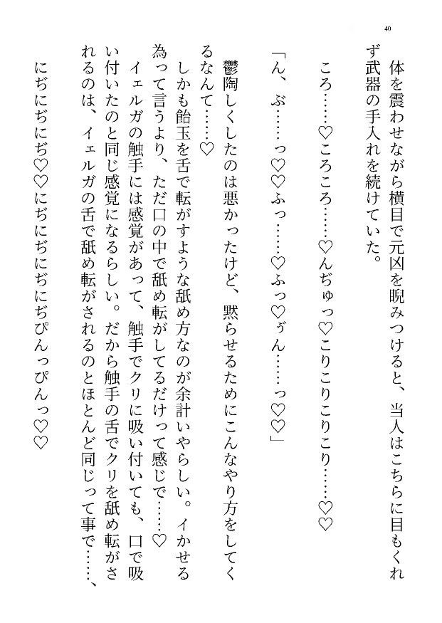寝ぼけたイェルガの触手に身体の弱いところをしごかれながら毎朝起こされるし、私がちょっと言う事を聞かなかっただけで楽しそうに触手が拘束してきて、駄目になる所をひたすら責めてくる。
