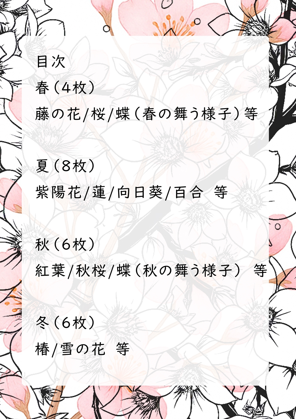 春・夏・秋・冬の花や蝶をテーマにした大人向け塗り絵です。