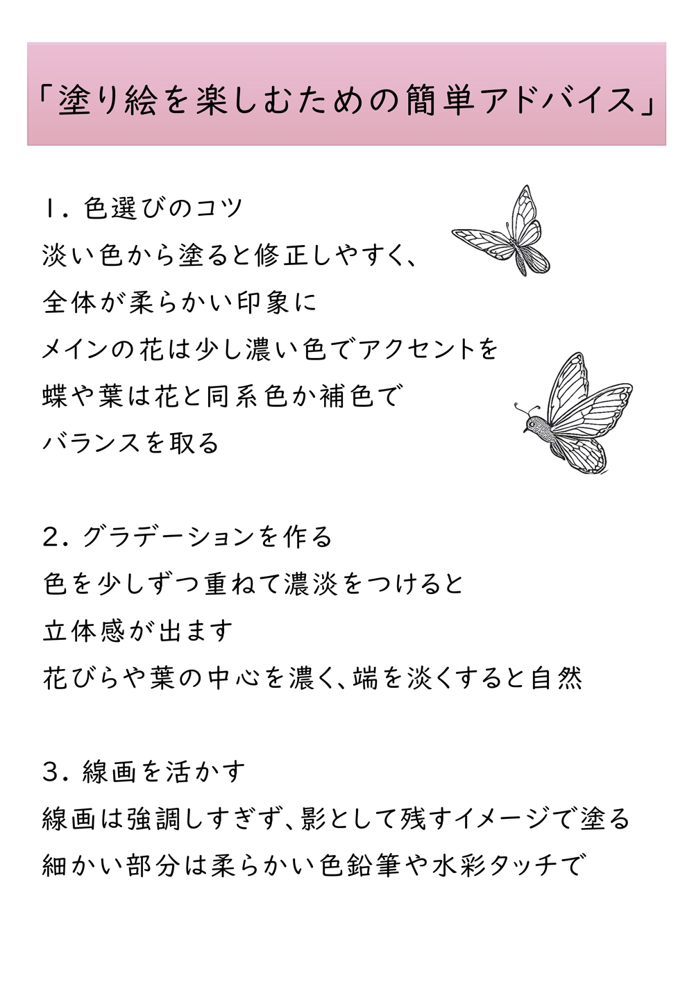 季節の花々や蝶たちと一緒に、ワクワクする塗り絵の旅に出かけませんか?