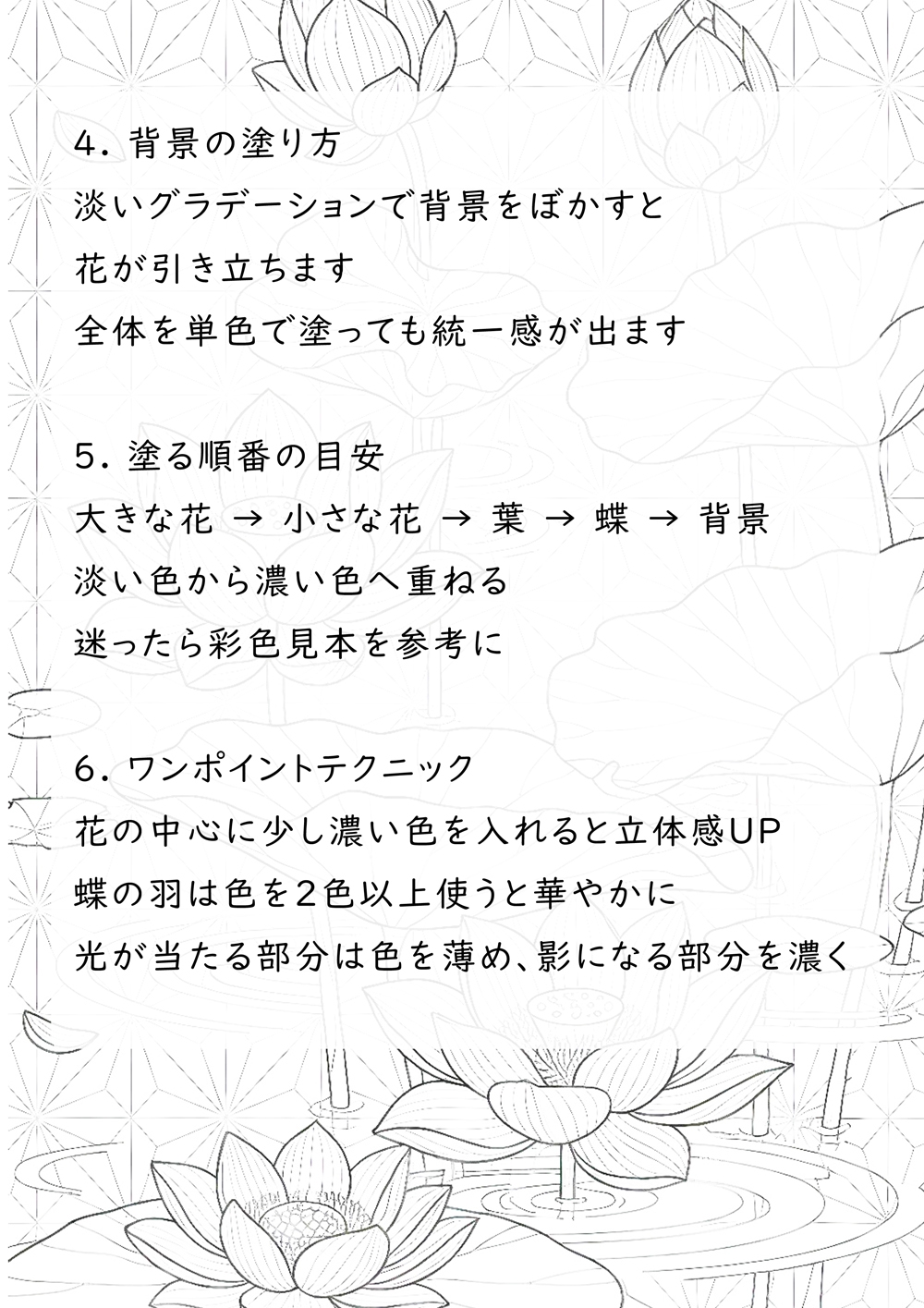 全29ページ(表紙・目次・塗り方のコツ2ページ・裏表紙付き)で、ページをめくるたびに四季折々の彩りの世界が広がります。