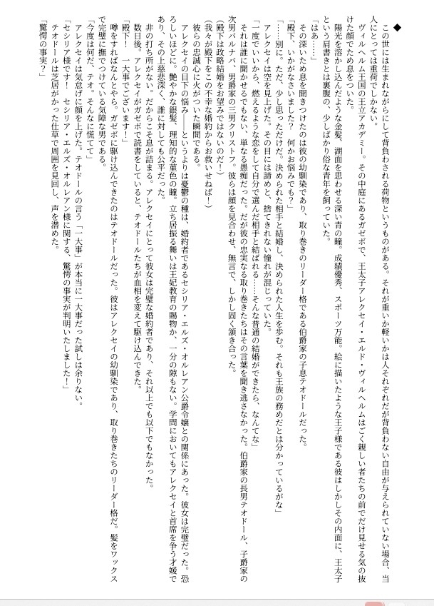 「政略結婚なんてクソ食らえだ!」絵に描いたような王子様でありながら、燃えるような恋に憧れる俗っぽい一面を持つ王太子アレクセイ。彼の憂鬱の種は、完璧すぎて息が詰まる婚約者セシリアとの決められた未来だった。