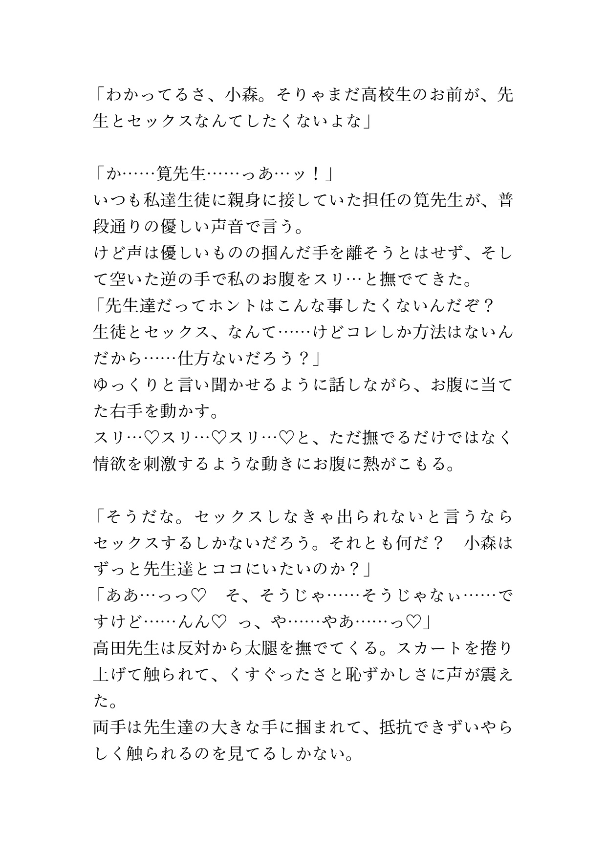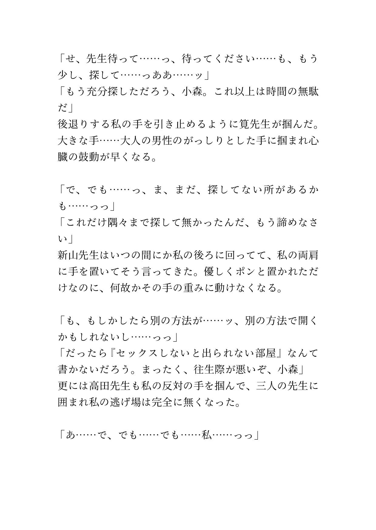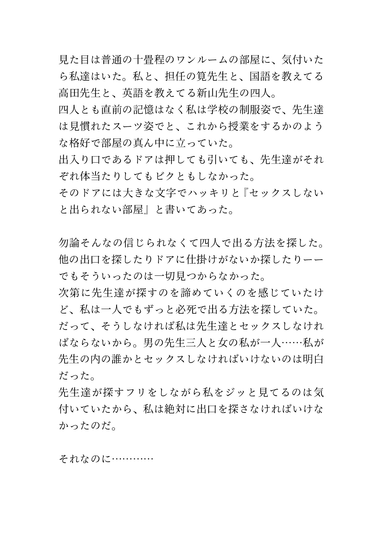 先生3人とセックスしないと出られない部屋に閉じ込められた女子生徒の話です。