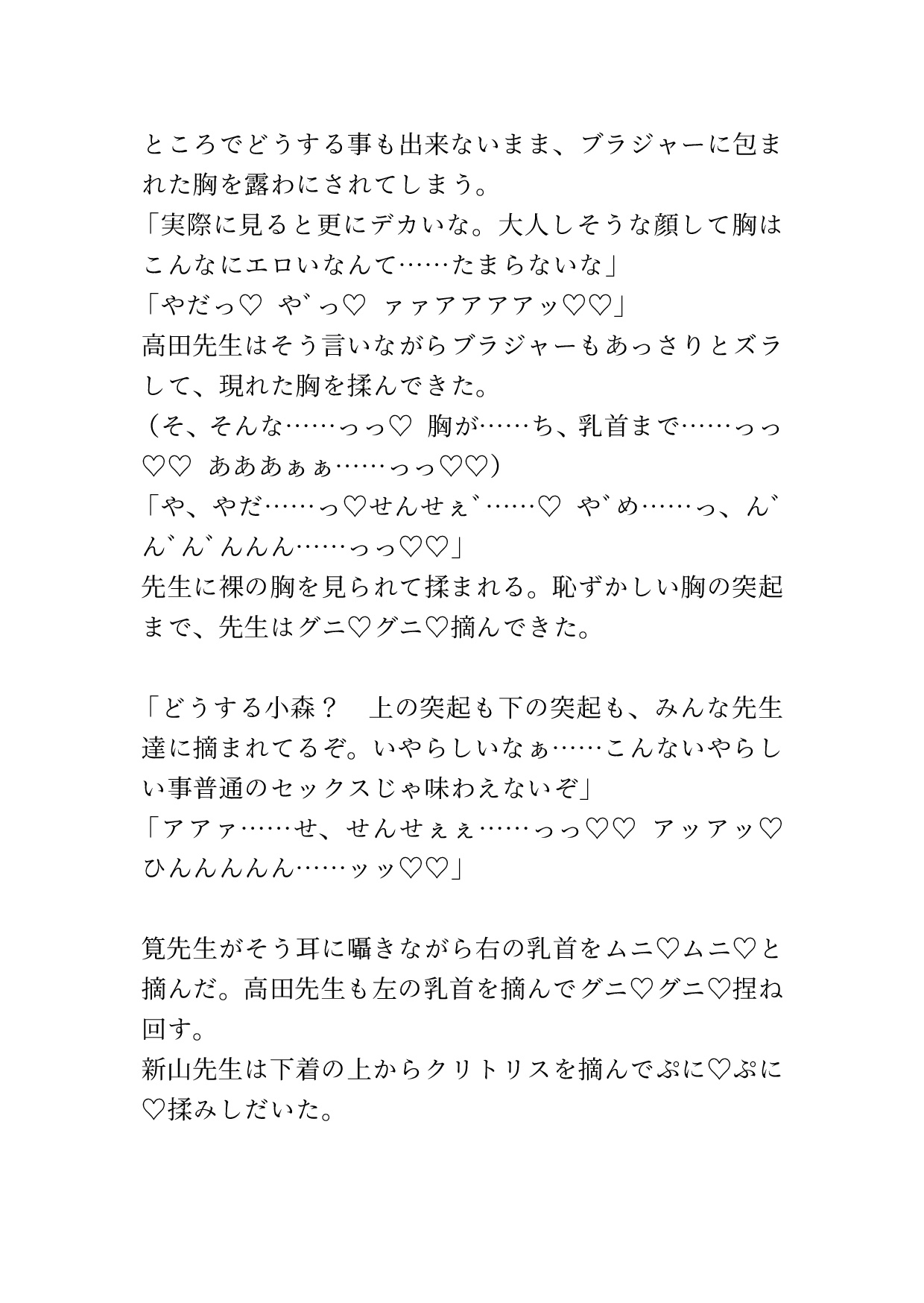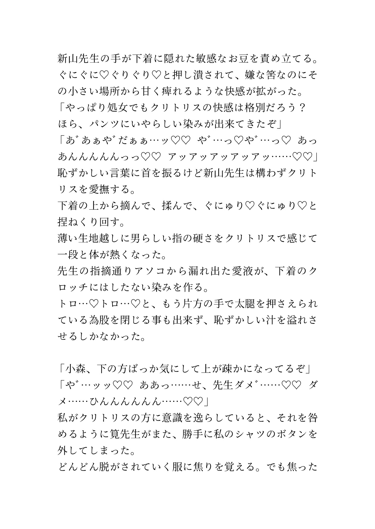 4P、教師×生徒、複数姦、クリ責め、乳首責め、クンニ、手マン、連続絶頂、中出し、ハート喘ぎ、濁点喘ぎ、擬音表現(オノマトペ)