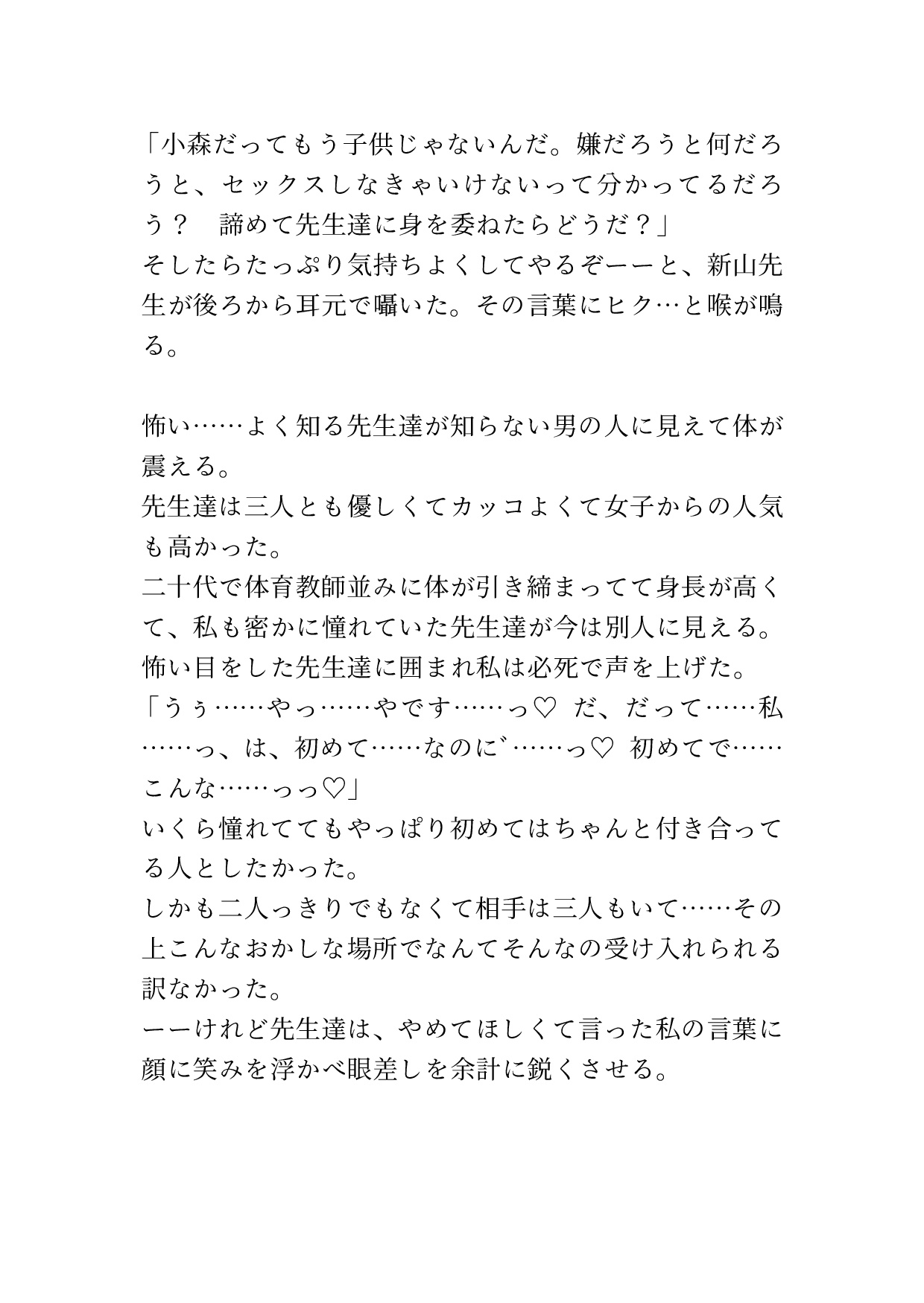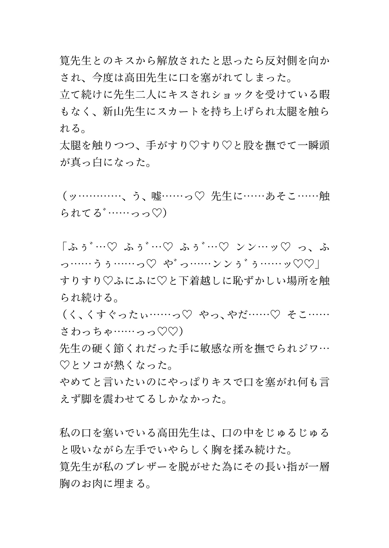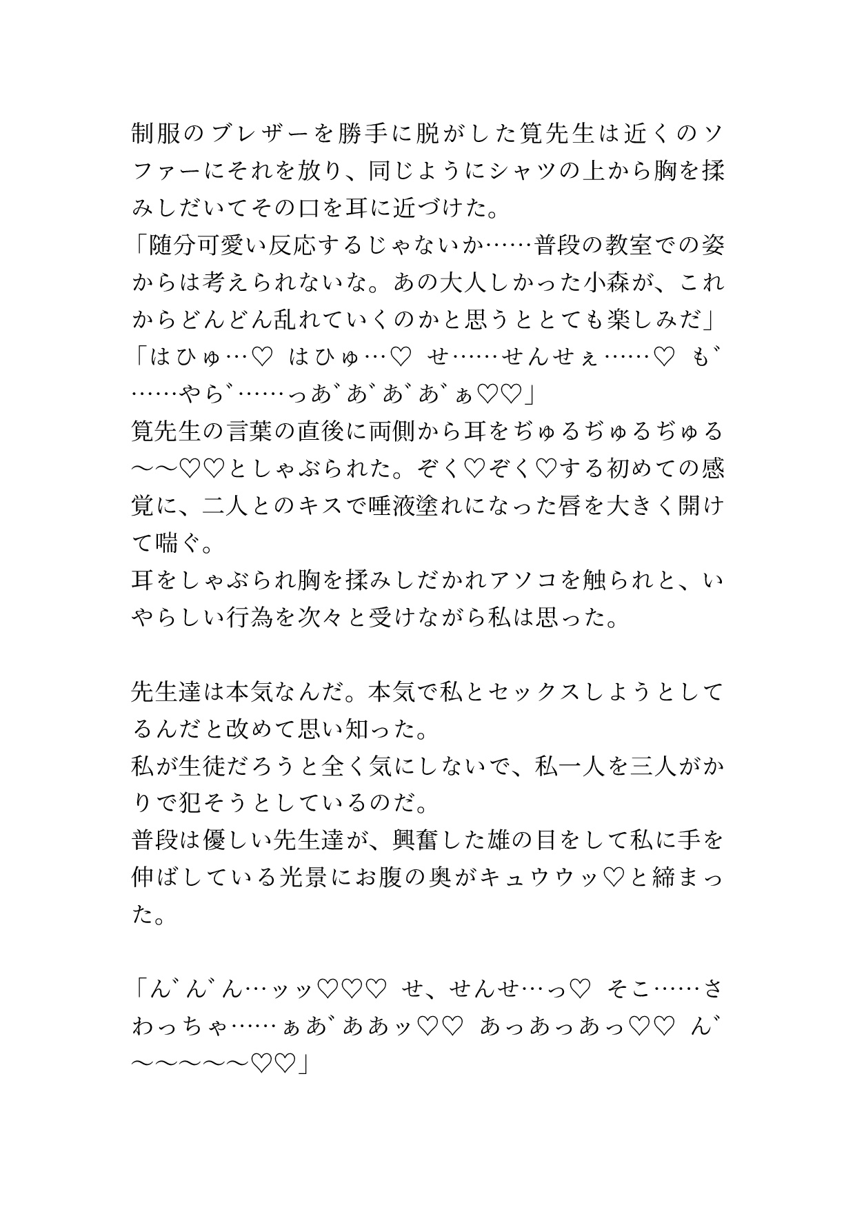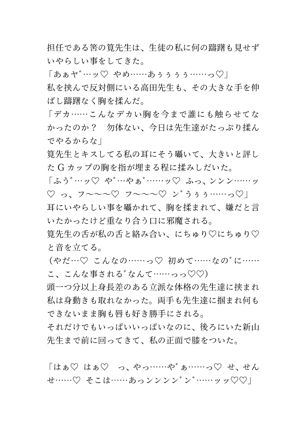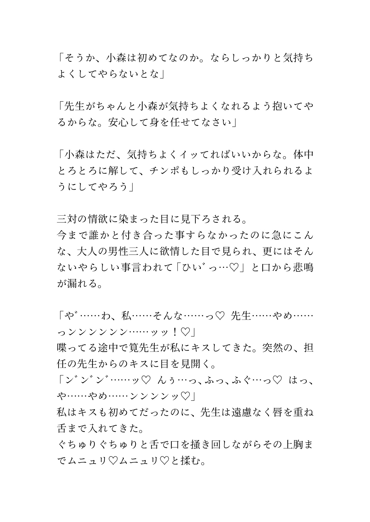 先生3人とセックスしないと出られない部屋に閉じ込められた女子生徒の話です。処女なのに先生達に責められて立ったままイかされて、その後はベッドの上でまた3人がかりで責められます。キスされ乳首を吸われクリをしゃぶられ指を入れられ、たっぷりとイかされてから3人それぞれに中出しされます。