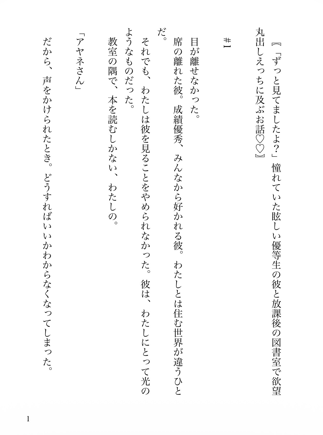 図書委員として図書室で作業をしていたアヤネ。作業中にいつも見ていた憧れのマナトに声をかけられて、いきなりえっちになだれ込むことに……。
