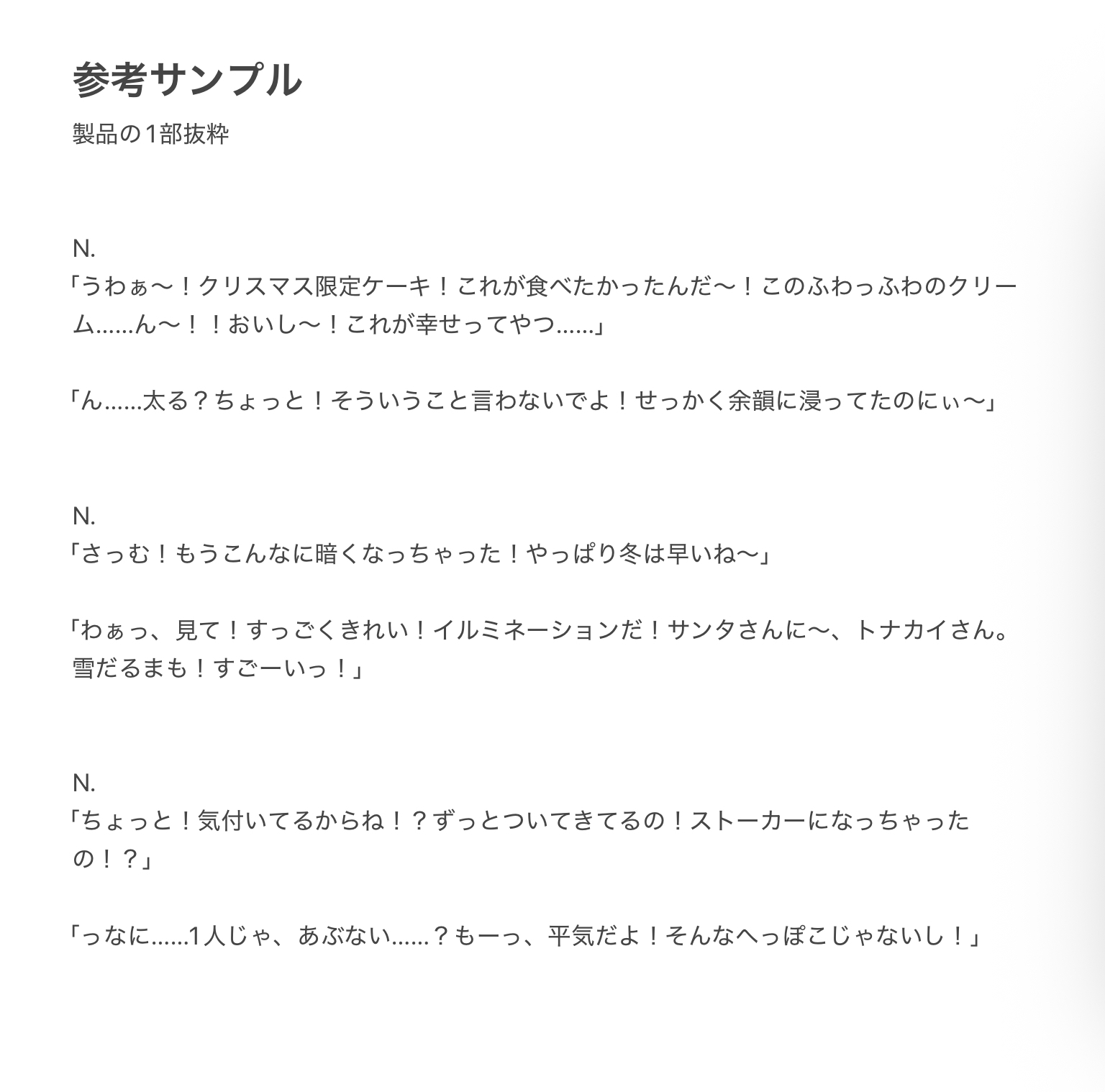 ・性別不問 台本自体は一人称(私)になっていますが、可愛い系、甘えたなど、大筋は犬系男子といった雰囲気での対応も可能な内容となっております。その際は必要によって一部(かわいい⇨かっこいい等)をアレンジしてお楽しみください(様子はサンプルをご確認ください)。