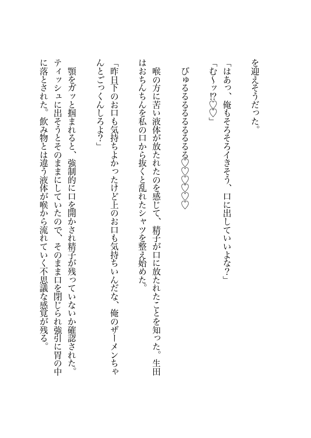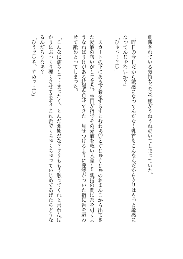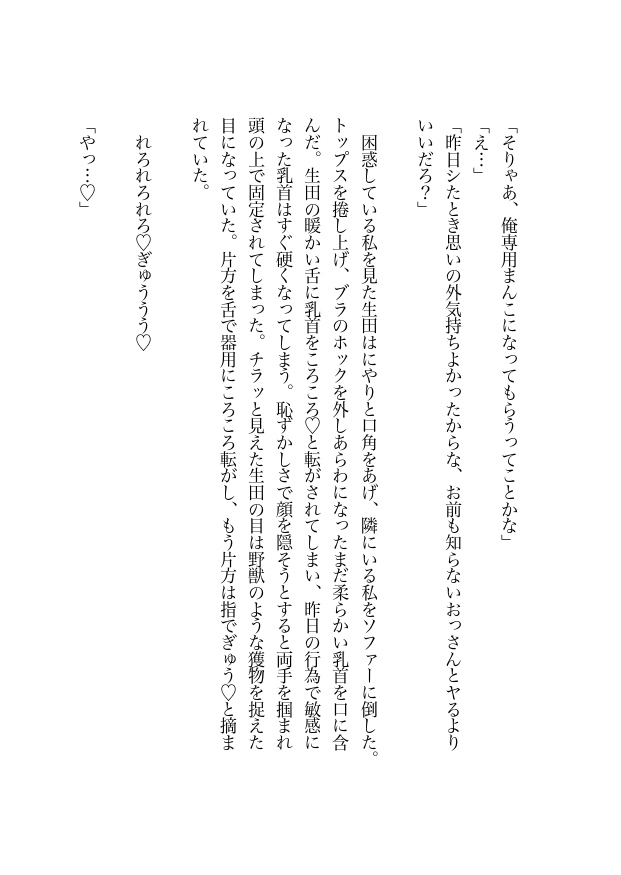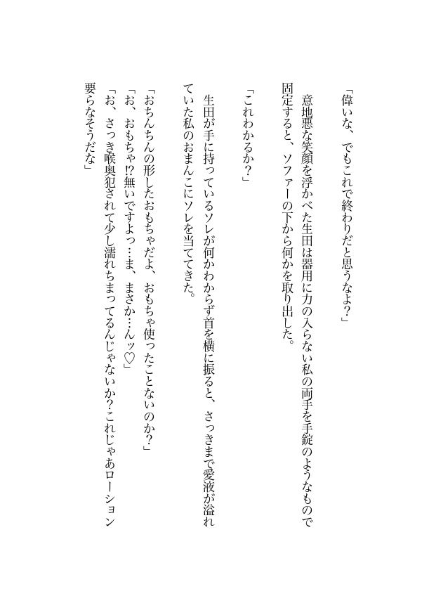 次の日仕事をするために生田の部屋に呼ばれるが、仕事の代わりに生田の家に住むように言われてしまう。家事などする予定だったが、生田が仕事の間おもちゃで遊ばれて放置されてしまい、とろとろになった私は生田の帰りをおもちゃの気持ちよさに耐えながら待つのであった。