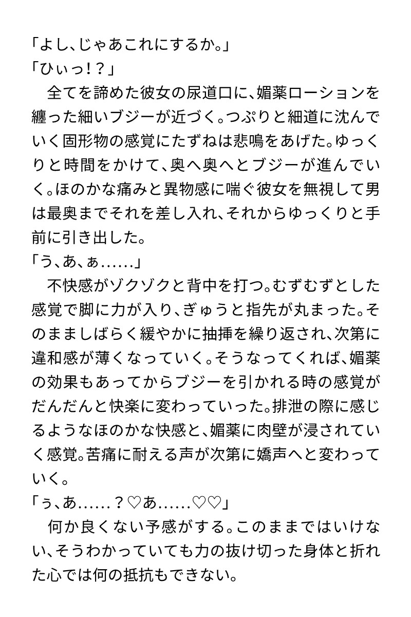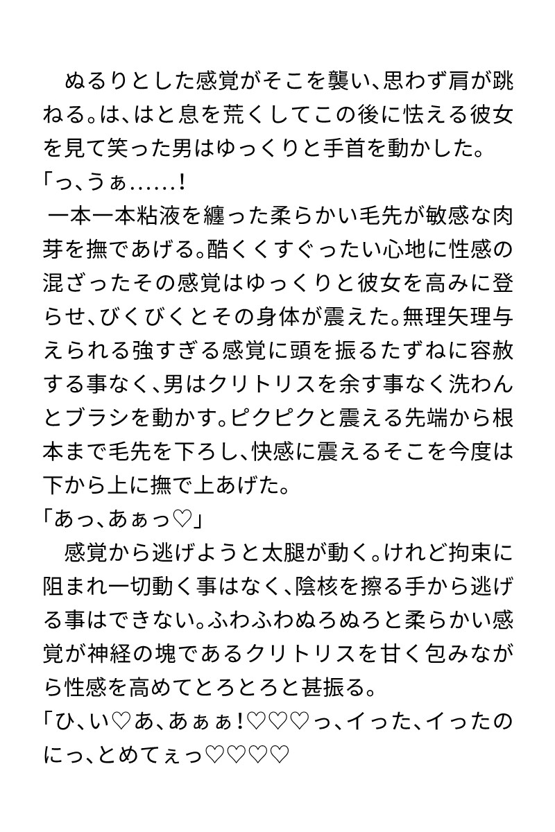 (拘束、媚薬、クリ責め、筆責め、おもらし、尿道責め、膀胱責め、連続絶頂、濁点ハート喘ぎ)