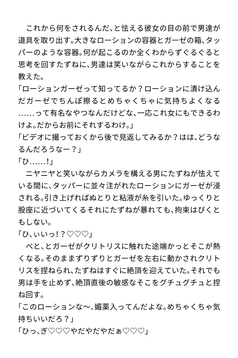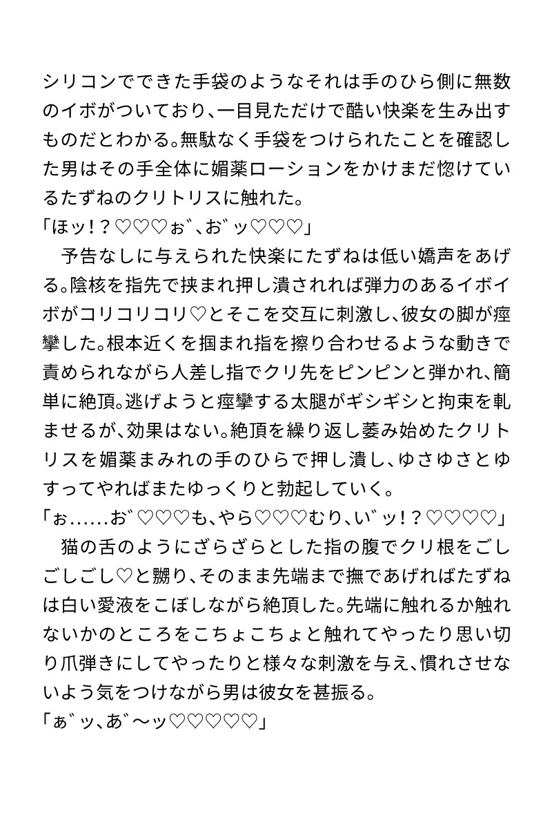 (拘束、媚薬、クリ責め、媚薬的宛て、ローションガーゼ、吸引バイブ、痒み責め、尿道責め、膀胱責め、連続絶頂、濁点ハート喘ぎ)