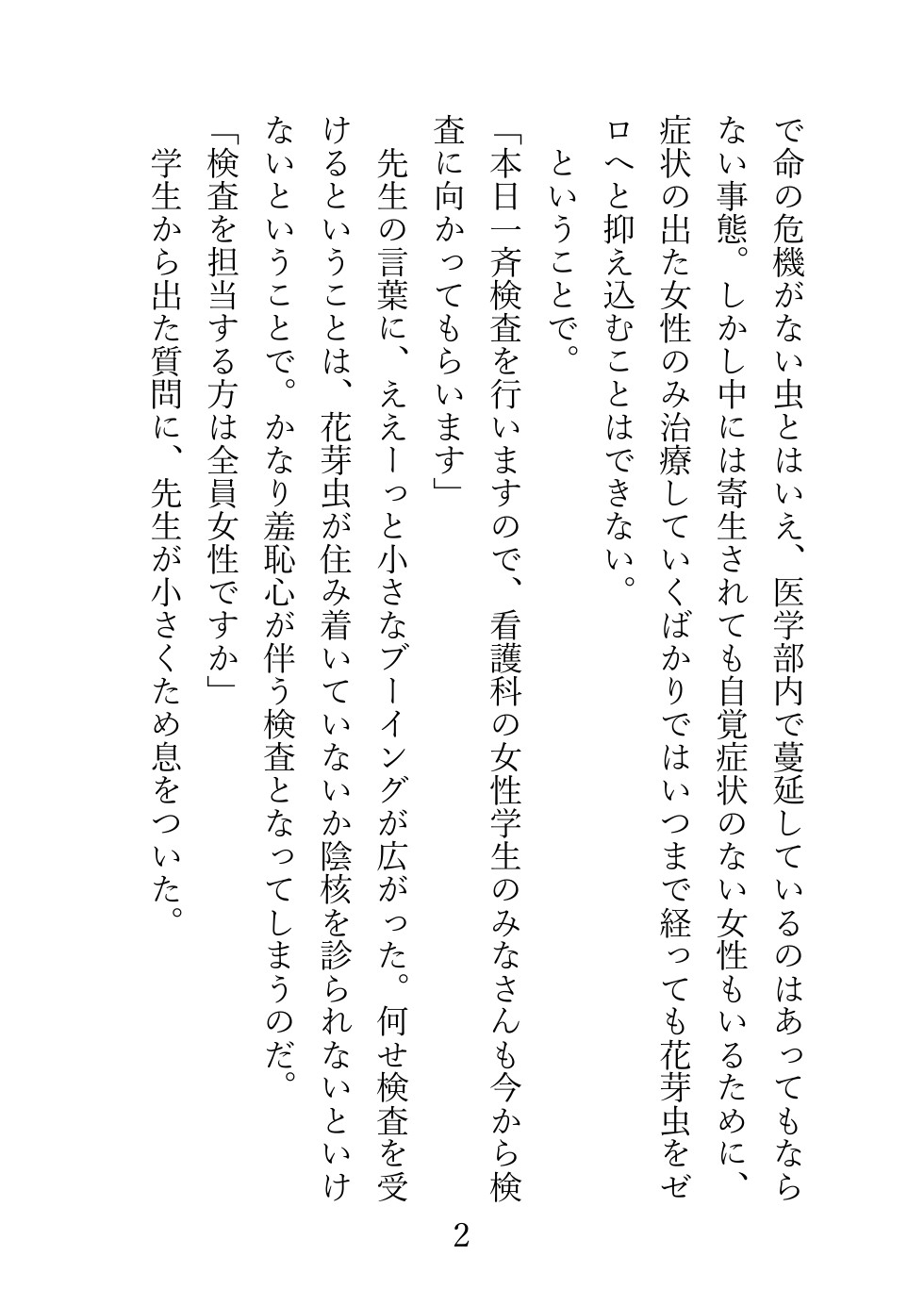 陰核に住み着く寄生虫「花芽虫」の感染拡大を防ぐために、一斉検査となったとある医学部。