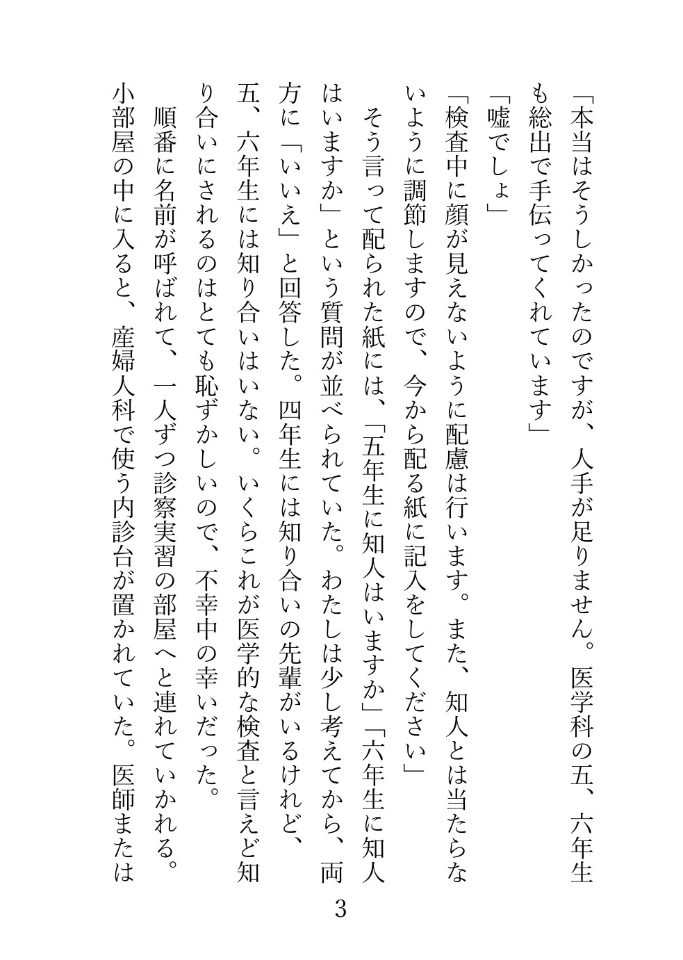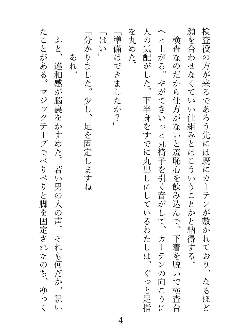 自分だとばれないように、声を出してはいけない。そんな状況で、陰核を綿棒で擦る検査が始まる。