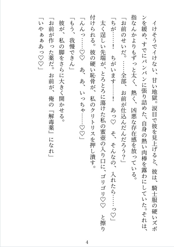 ドジな魔女の私は、堅物騎士ヴァレリウス様を救おうとして大失敗。「一日三回発情する媚薬」を飲ませてしまう!責任を取って彼の「解毒(セックス)」役になる強○同居がスタート。理性が溶けた彼は獣のように私を貪り、私も快楽に溺れていく。やがて彼は「薬のせいではない」と愛を告白。氷の騎士は私だけを溺愛する「どろあま騎士」に変貌し、今日も濃厚な「食後の運動」に励むのだった。ギャグ甘エッチなラブコメ。