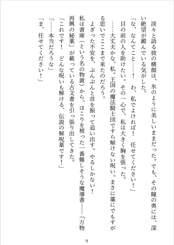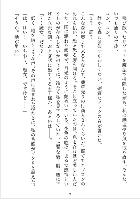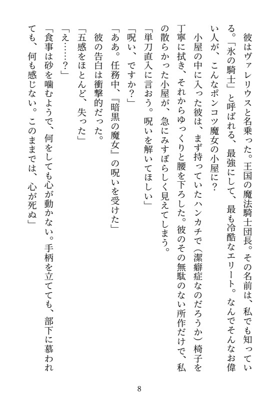 王国の魔法騎士団長。「氷の騎士」と呼ばれるエリート。氷のように美しい完璧な美貌を持つ。 生真面目で厳格、潔癖症。「快感」を失う呪いにかかり、ヒロインの元を訪れる。 ヒロインの作った媚薬のせいで、一日に三度、理性が飛びかけるほどの熱に浮かされる。表向きは堅物だが、薬が効くとヒロインの匂いや声に過敏に反応し、独占欲と性欲を露わにして彼女を貪り尽くす。ファンタジー / 魔女 / 堅物騎士 / 媚薬 / ギャグあまあま / ギャップ萌え / 独占欲 / 快感堕ち / 中出し / 連続絶頂