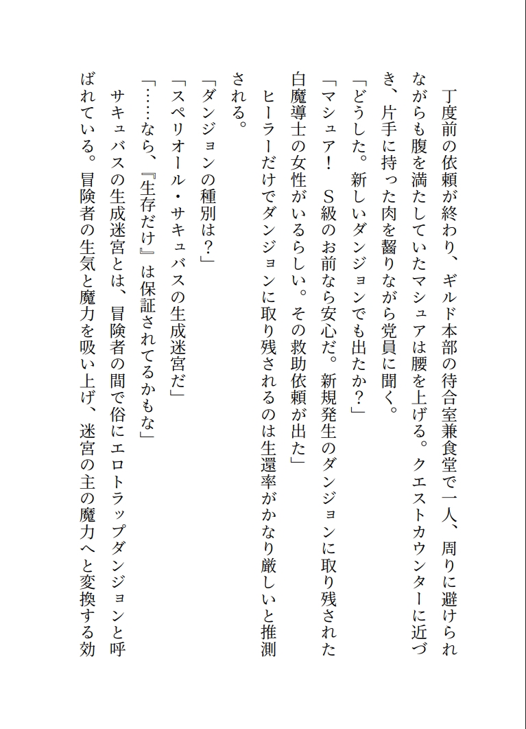 ギルド一の実力を持つ半人半獣のマシュアのもとに、緊急の救助依頼が出される。内容は、サキュバスの生成したエロトラップダンジョンに、一人の白魔導士が取り残されてしまったというものだった。急ぎ救助に向かい、なんとか救出するが、その場で彼女に一目ぼれしてしまう。だが、彼女にはダンジョンの主であるサキュバスから施された淫紋が残っており──!?