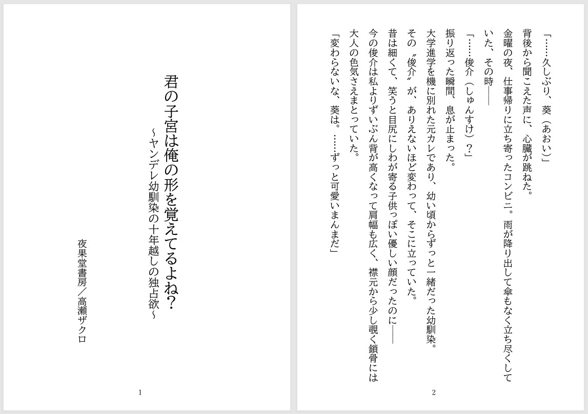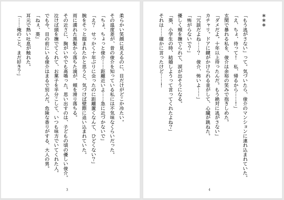 「葵……俺のこと、まだ好き?」 偶然再会した幼馴染兼元カレの俊介。 昔の面影は消え、背が高く色気たっぷりの大人の男に変わっていた。葵は俊介のマンションに連れ込まれ、甘く執拗な愛撫に翻弄される。 「もう逃がさないよ。葵は俺のものだから」 ──キスから始まり、首筋、胸、秘部……俊介の指と舌が葵の体を隅々まで覚醒させ、何度も絶頂を強いる。 言葉責め、連続中出し……葵の体は俊介の形に染められていく。