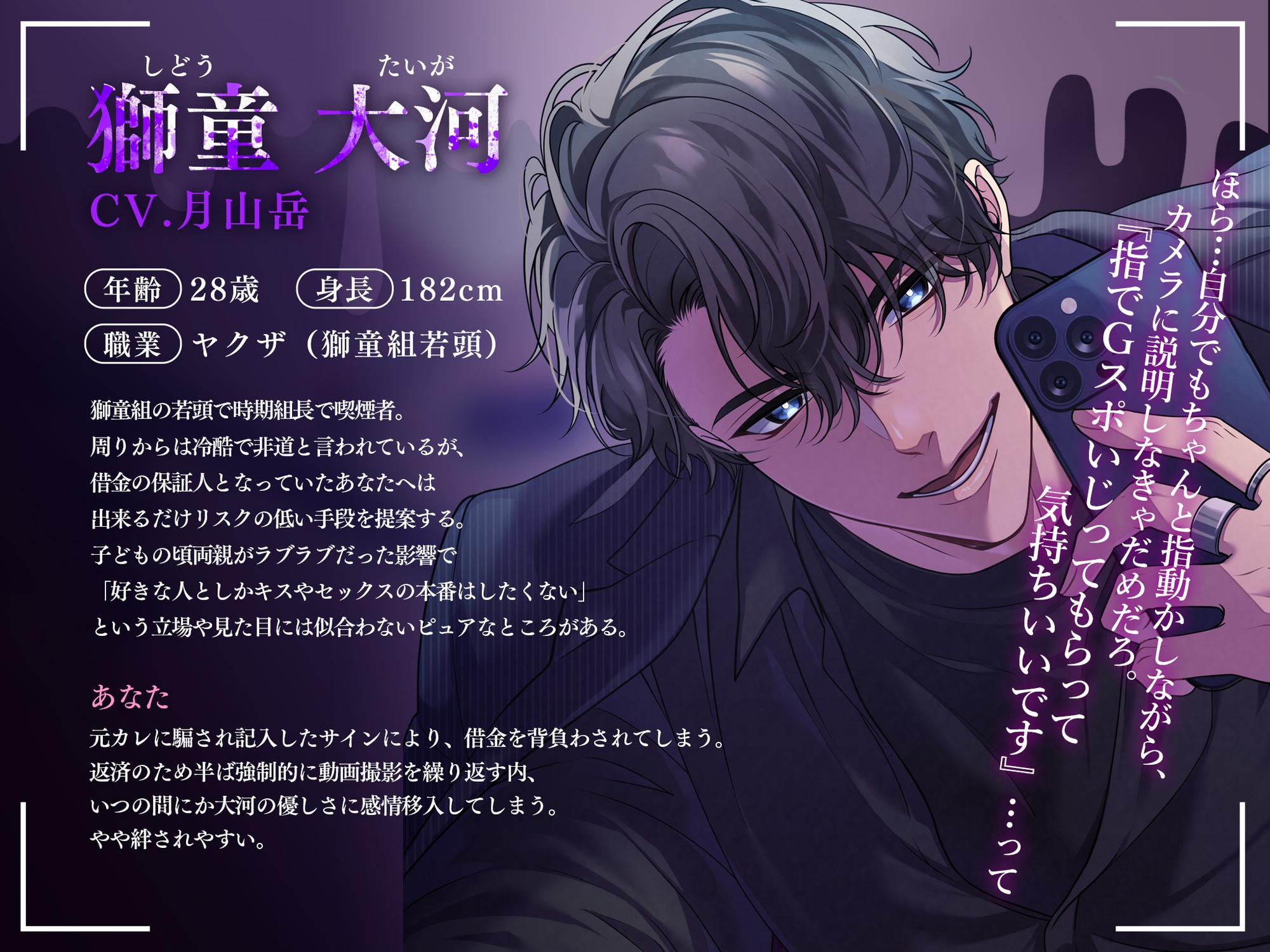 ある夜、あなたの家に訪ねてきたヤクザの男、獅童大河。 彼の言葉で、元カレに騙され借金の保証人にされていたことを知る。 元カレが逃げたことで、借金はあなたが払わないといけなくなってしまった。 総額1000万。返せる金額ではないとショックと同時に途方にくれたあなたに、 大河から顔出しなしのエロ動画を定期的に撮影して売ることを提案される。 あなたが逃げないために彼が動画を撮ることになるが…?