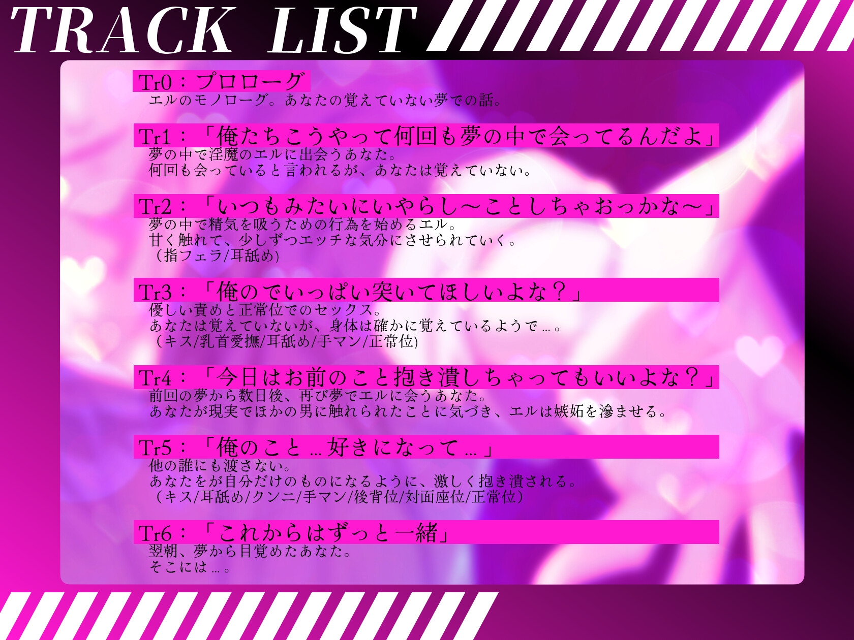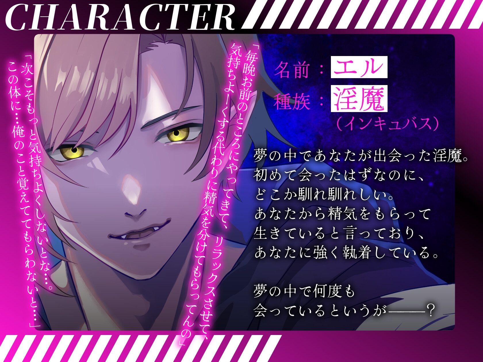 夢の中で出会った淫魔・エル。 あなたが覚えていないだけで、何度もこうして会っていると言う。 精気をもらうと言って、甘い快楽を与えてくる彼だが、 少しずつ、あなたへの執着が滲みはじめて──。(CV:安堂之)
