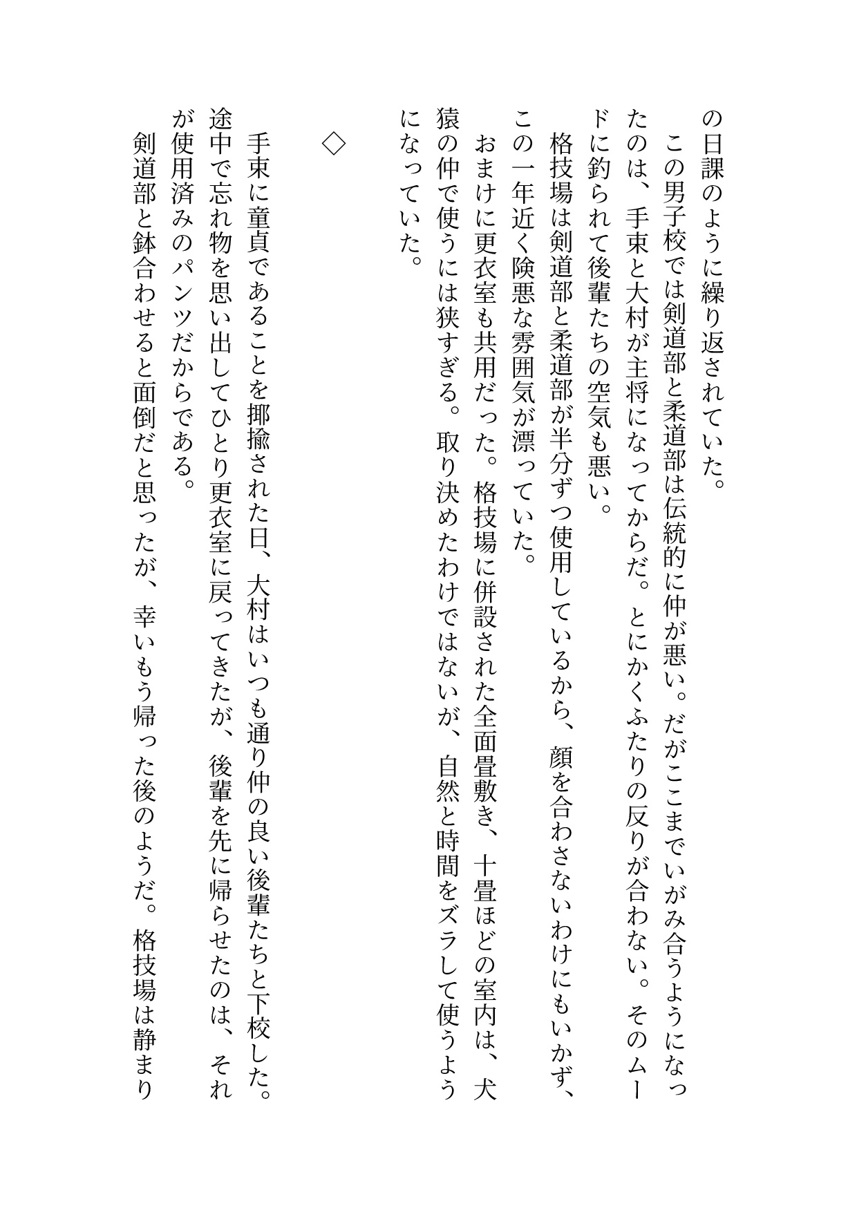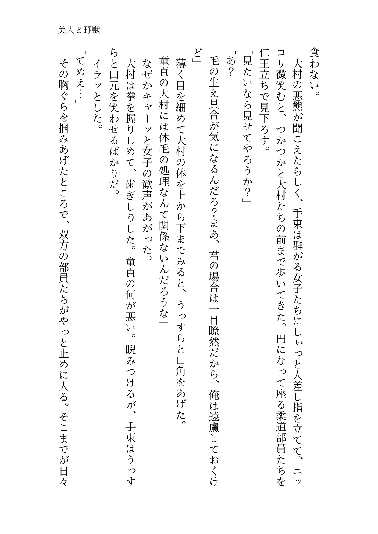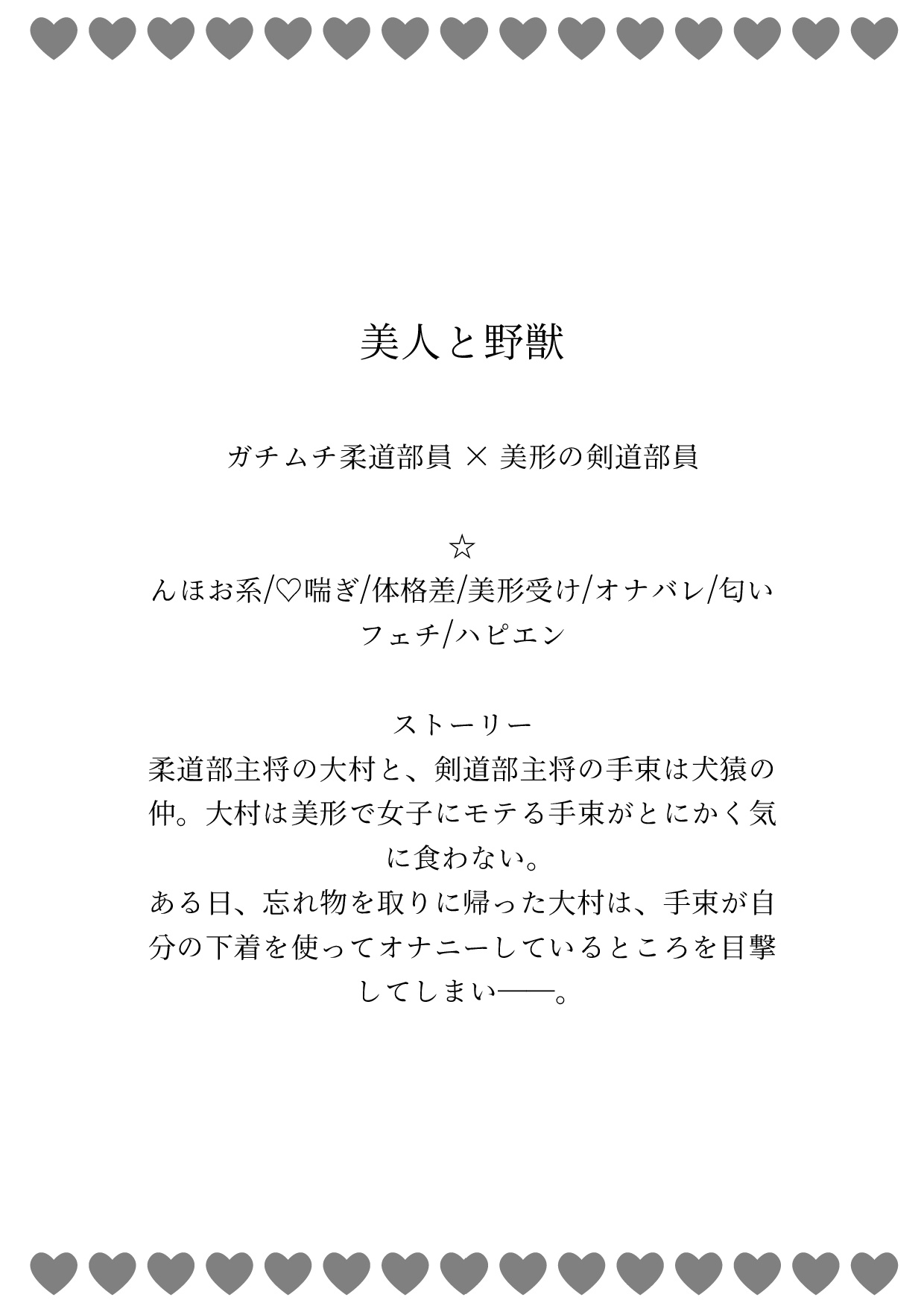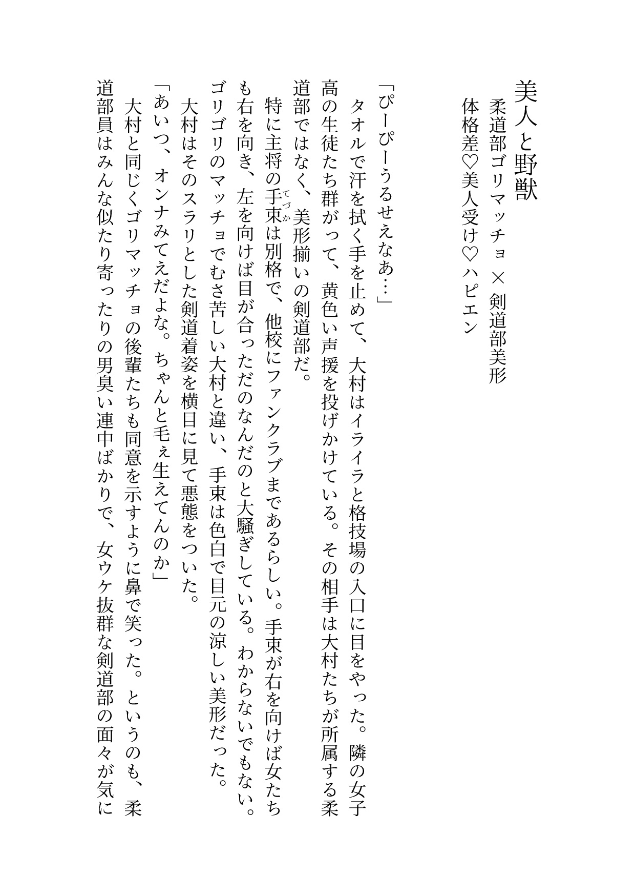 ・ガチムチ柔道部主将×美形剣道部員の犬猿バトルエロ「美人と野獣」。