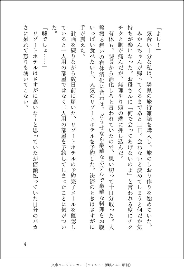 会えばまた苦しくなるだけだと考えたあなたは、彼の帰省期間に合わせて、消化を迫られていた有休をまとめて取り、一人で豪華温泉旅行へ行く計画を立てることに。
