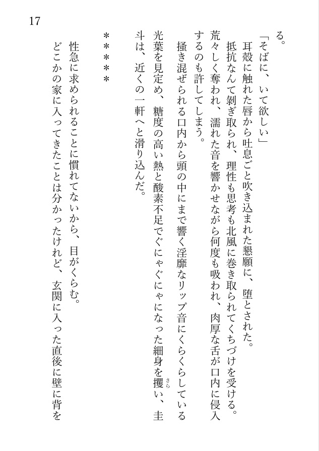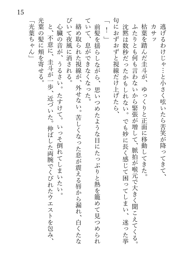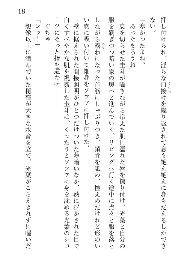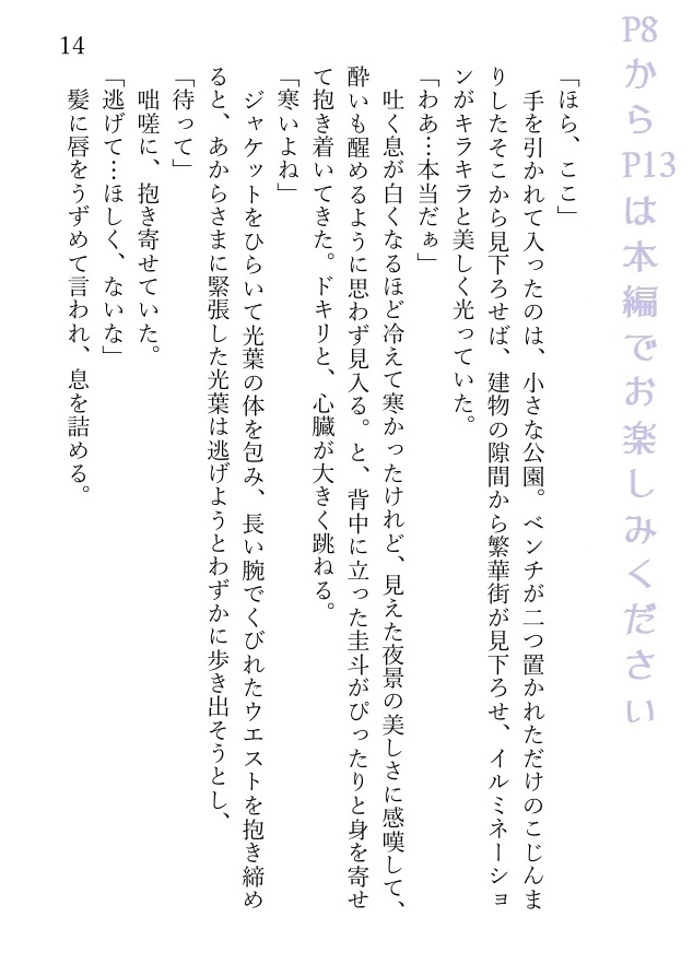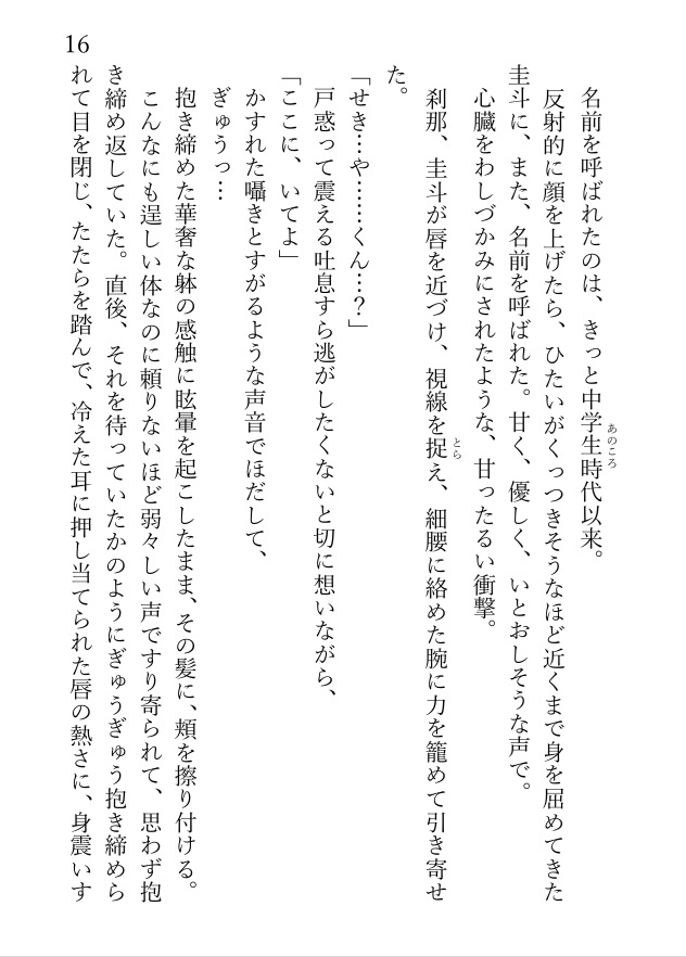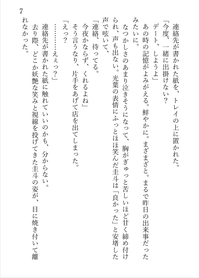 十数年全く連絡を取り合わなかった圭斗に誘われるまま水族館デートした光葉は、そのまま圭斗に抱きしめられてキスされ、家に連れ込まれて濃密な一晩を過ごすことになる。