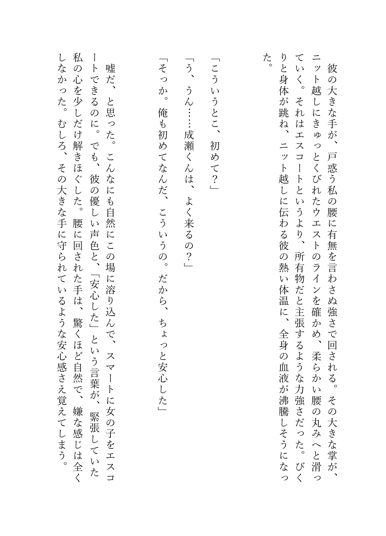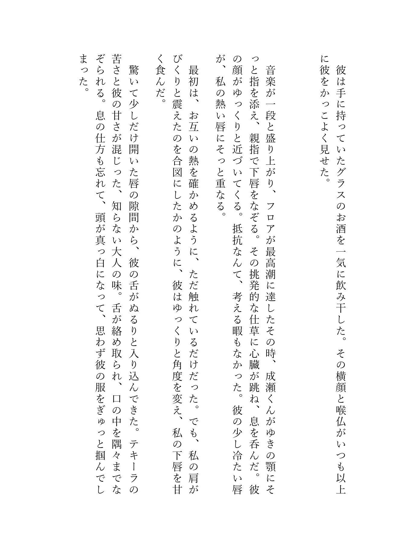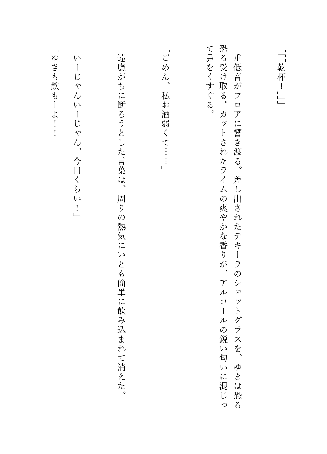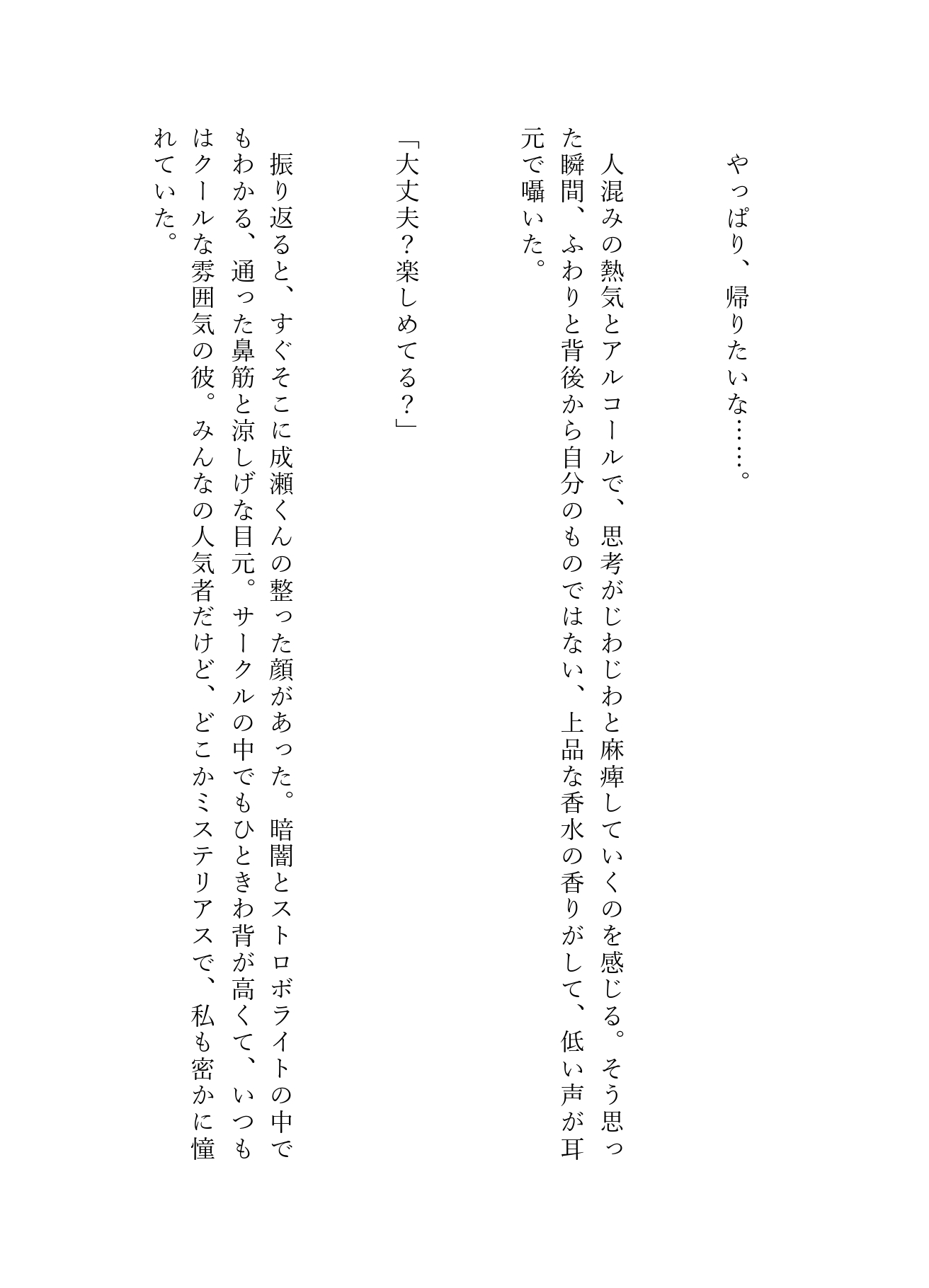 人混みの死角にあるソファ席、そして二人きりの個室トイレ。 アルコールと熱気に浮かされたゆきは、成瀬の甘い言葉に翻弄され、初めての快感に溺れていく――。