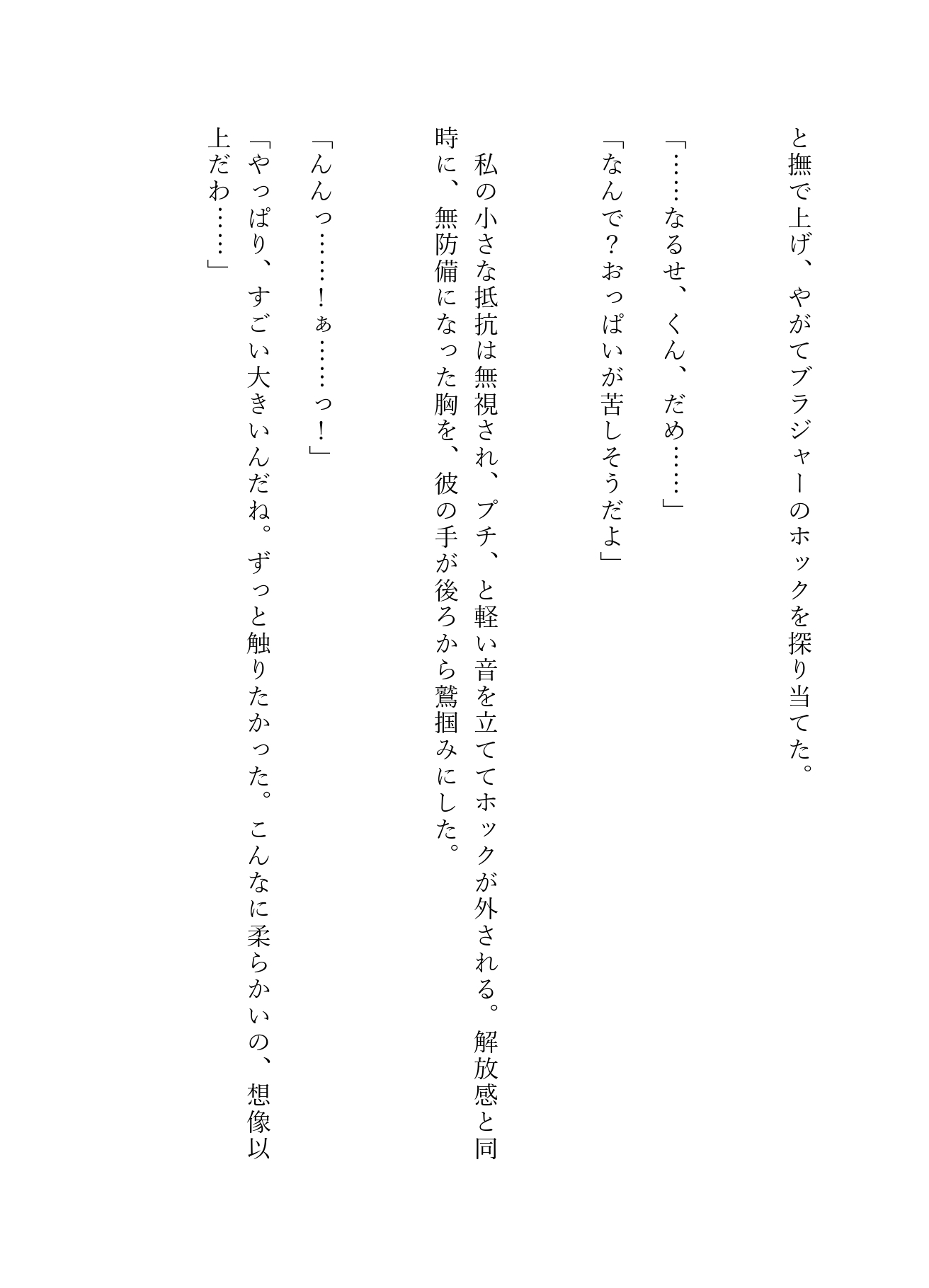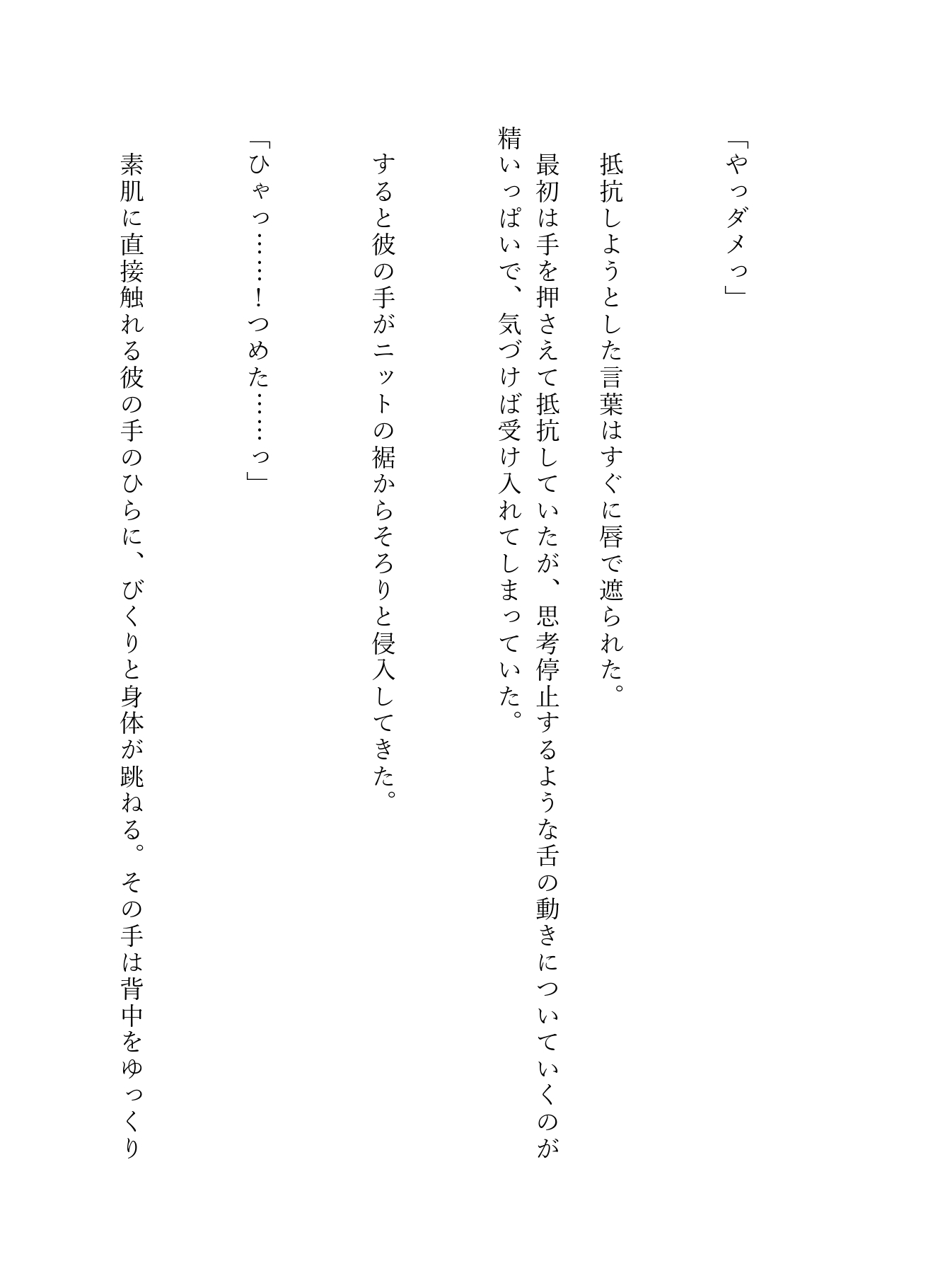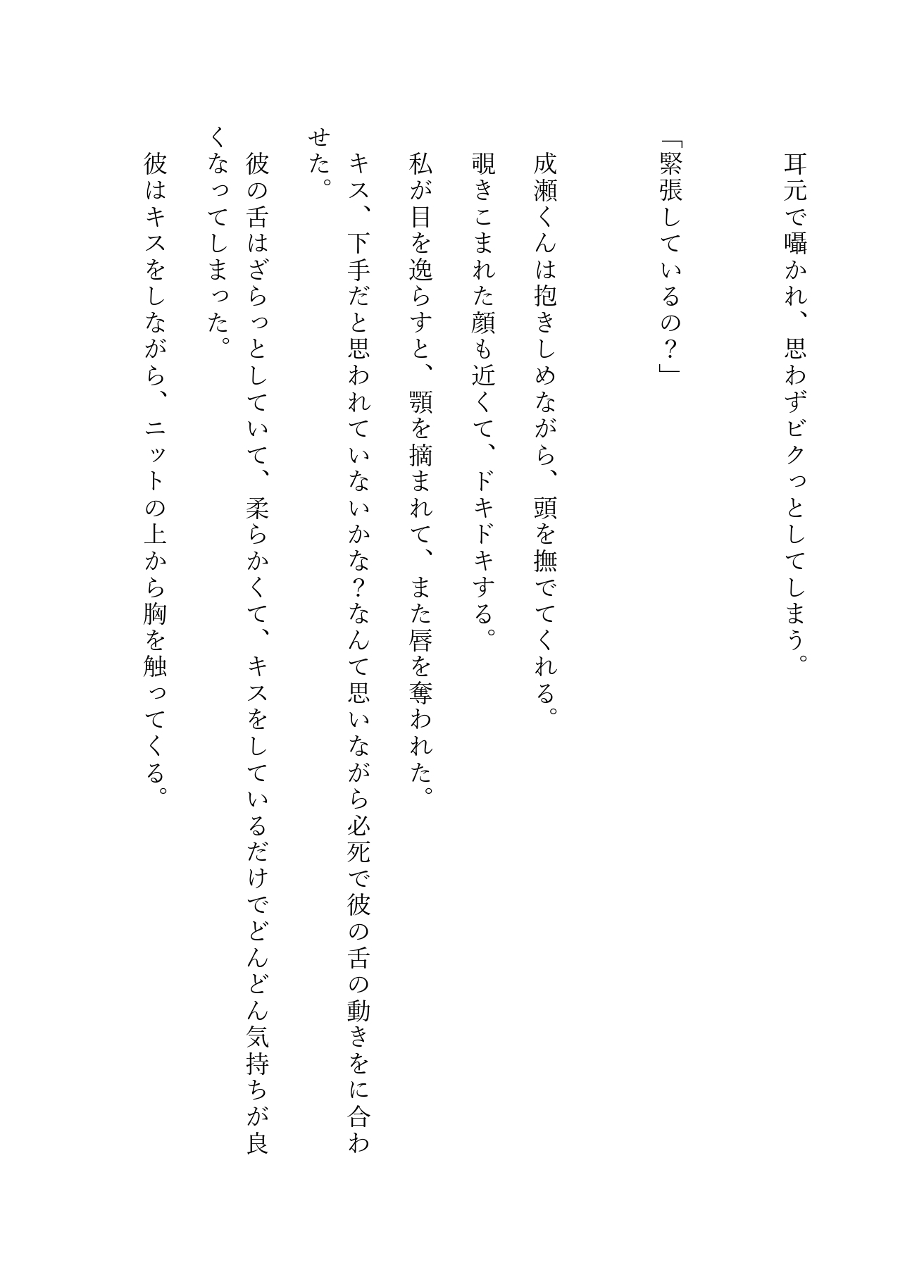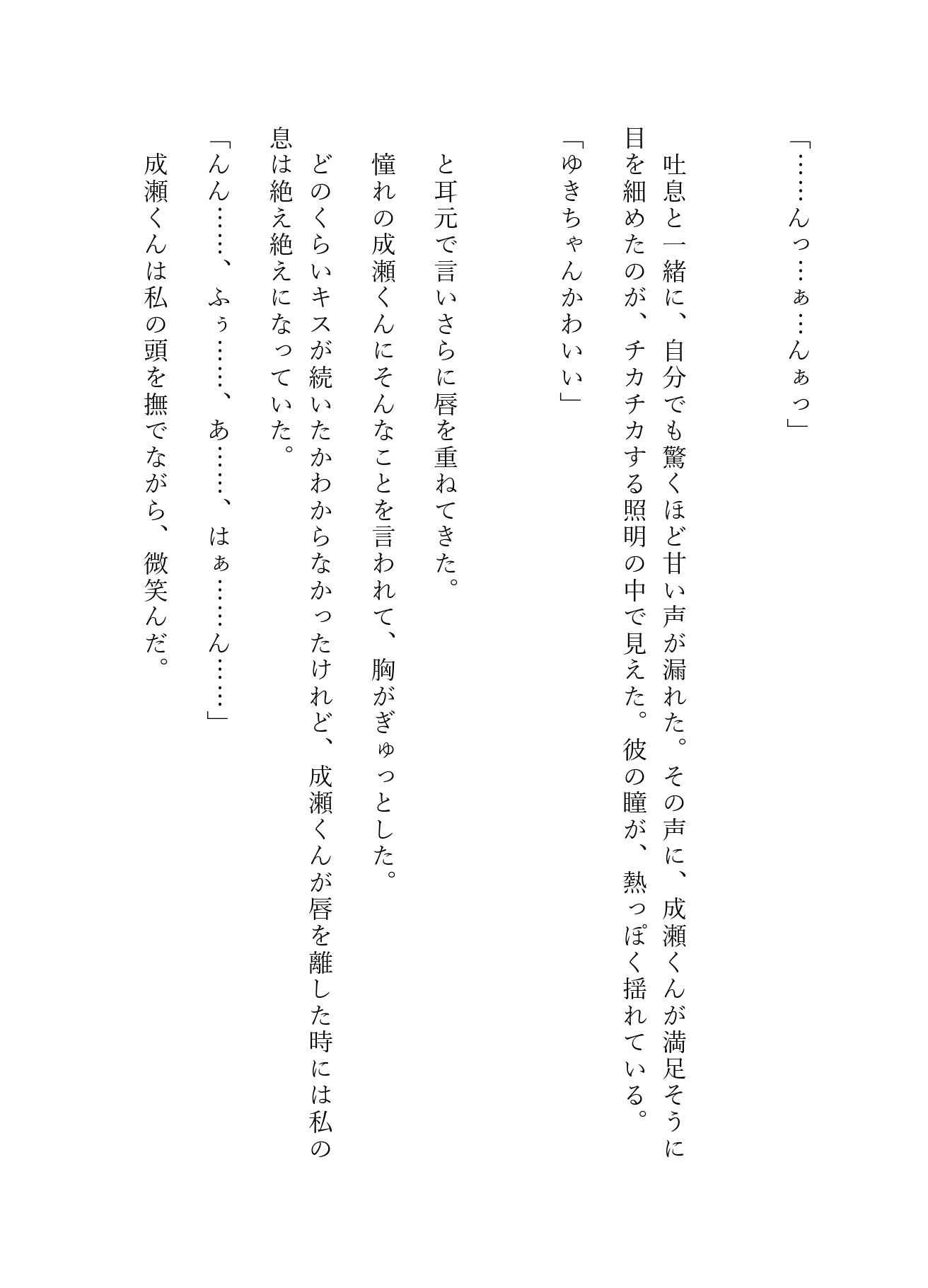 人混みの死角にあるソファ席、そして二人きりの個室トイレ。 アルコールと熱気に浮かされたゆきは、成瀬の甘い言葉に翻弄され、初めての快感に溺れていく――。