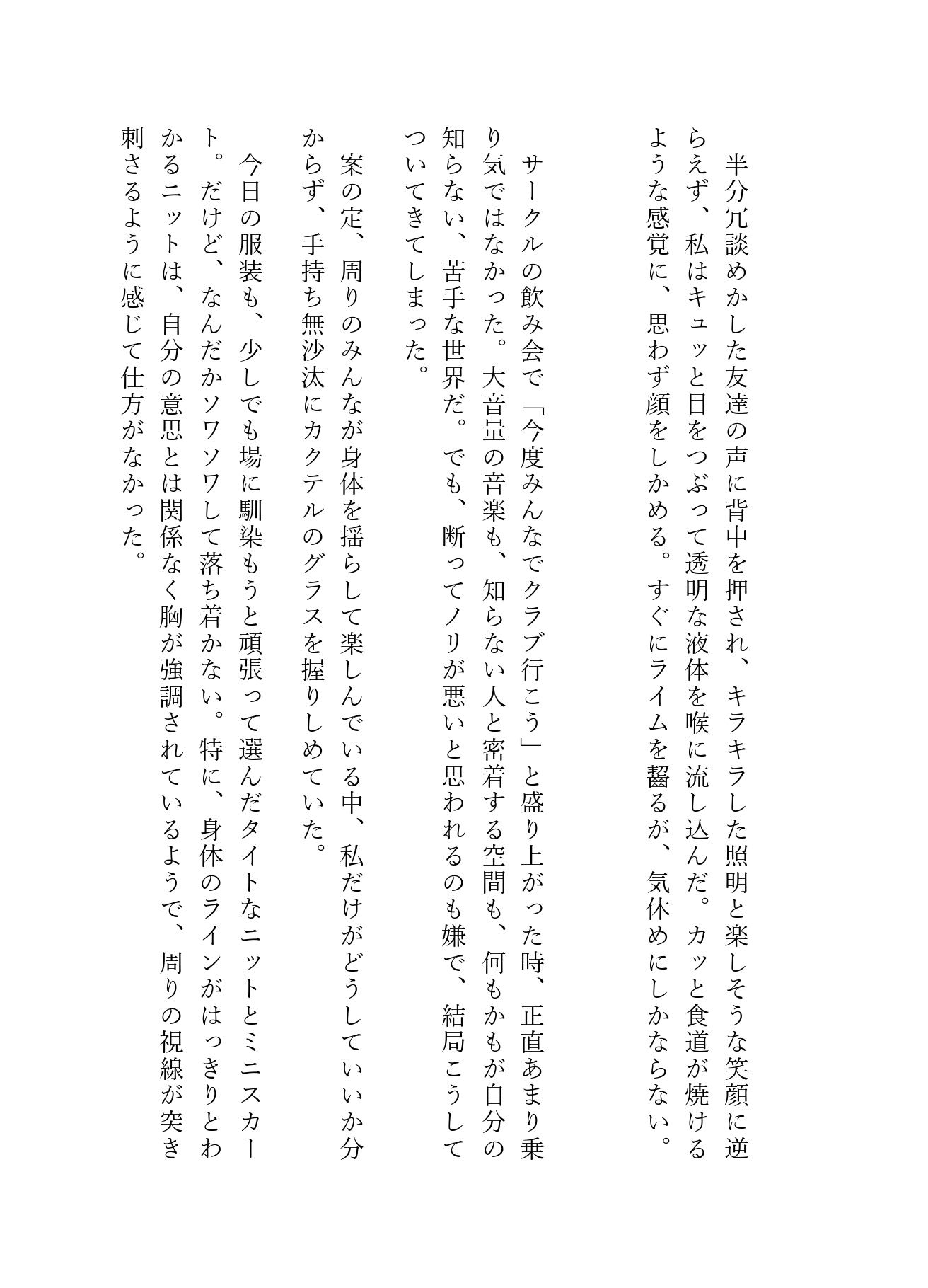 サークルの付き合いで訪れた、重低音が響くクラブのフロア。 お酒も場の雰囲気も苦手なゆきは、露出度の高い服を着てきてしまったことを後悔しながら、帰りたい気持ちを抑えていた。