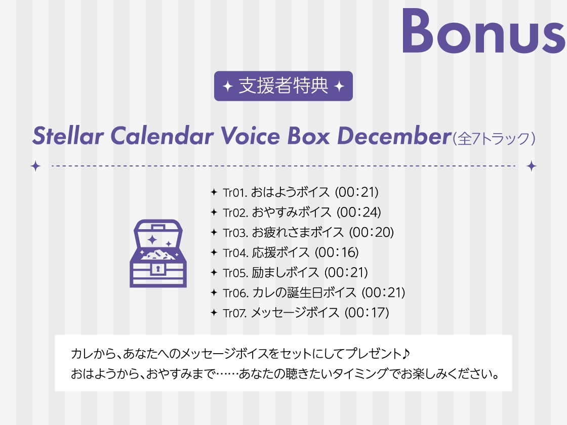 ボイスデータと、本編が始まる前のカレとの前日譚を描いたショートストーリーのデータを収録。ショートストーリーは、本編をお聴きいただく前にお読みいただくと、本編をよりお楽しみいただけます。