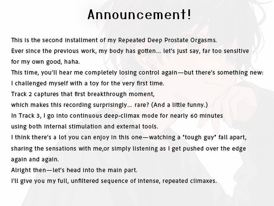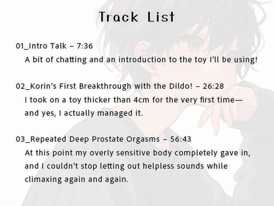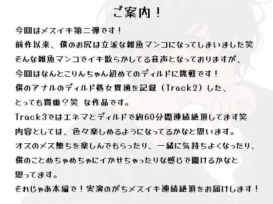長時間のメスイキ作品です!なんと僕が初めてディルドに挑戦したアナルのディルド処女貫通を記録しています!1時間の連続イキ音声もあるのでメスイキ盛りだくさんでお届けします!
