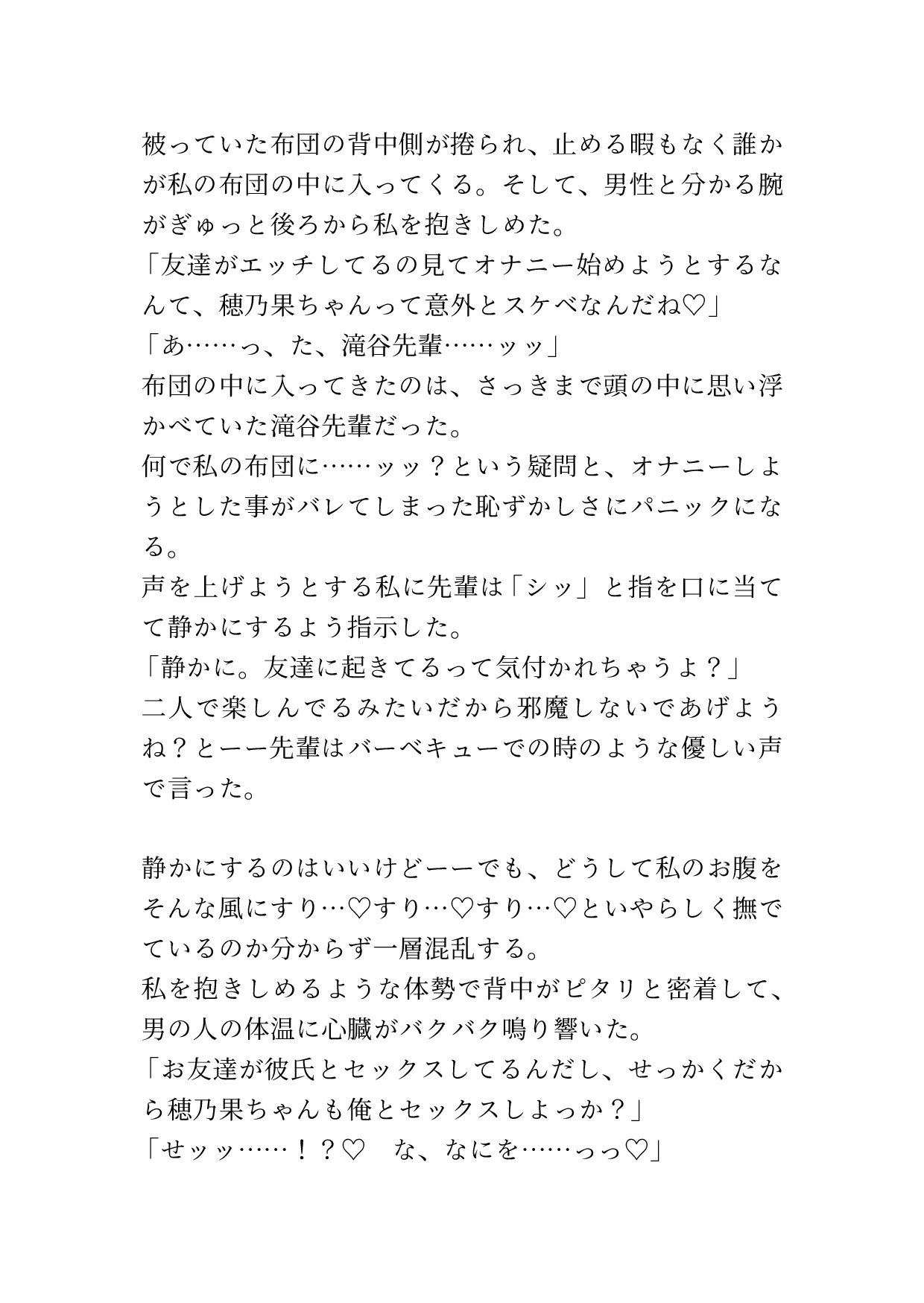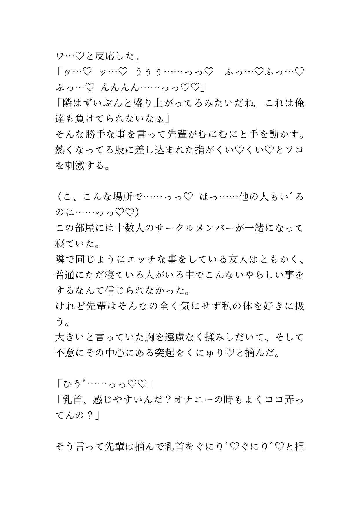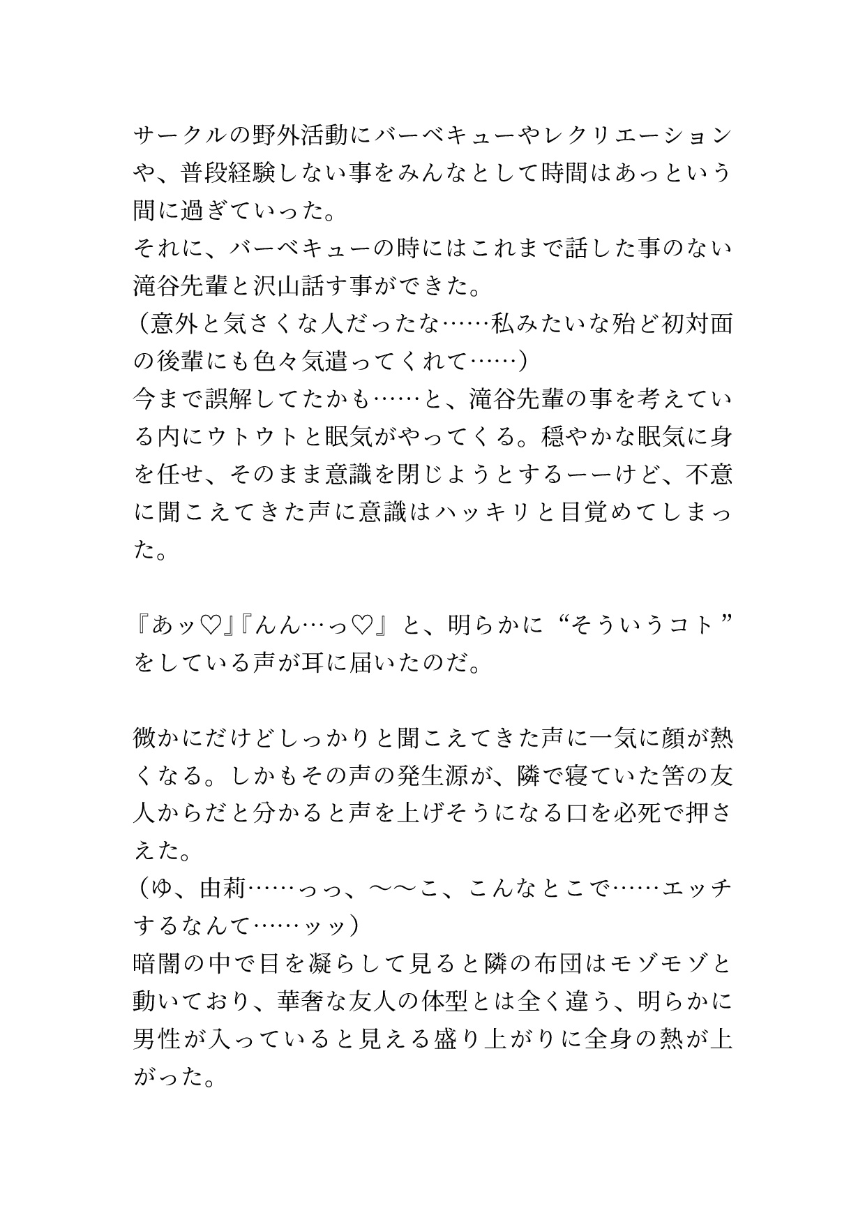 サークル合宿の夜に隣で寝てる友人が誰かとエッチしてる事に気付いて、思わずエッチな気分になってオナニーをしようとしたら、突然先輩が同じ布団の中に入ってきてそのまま沢山いやらしい事された後に、後ろから挿れられてしまう話です。