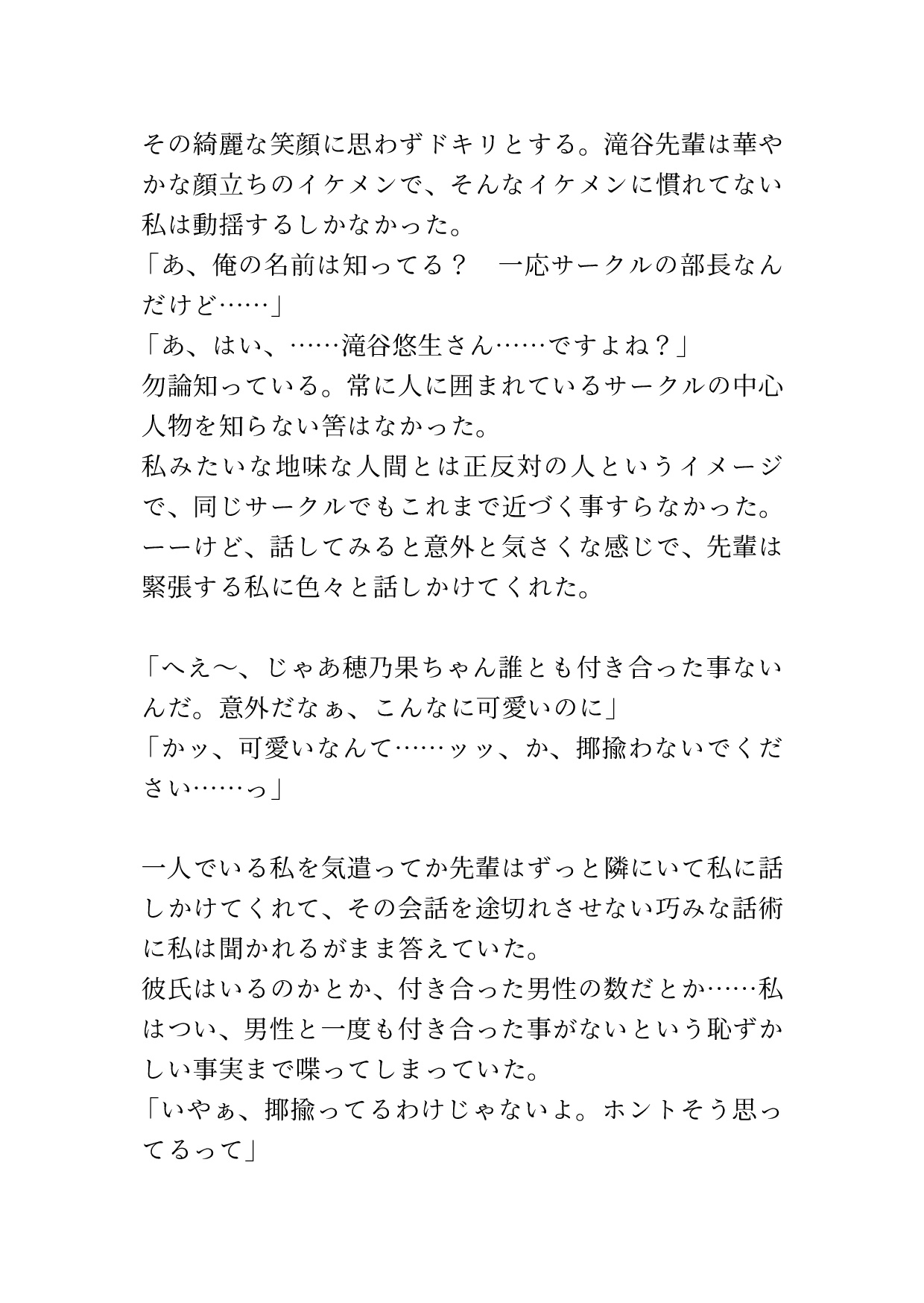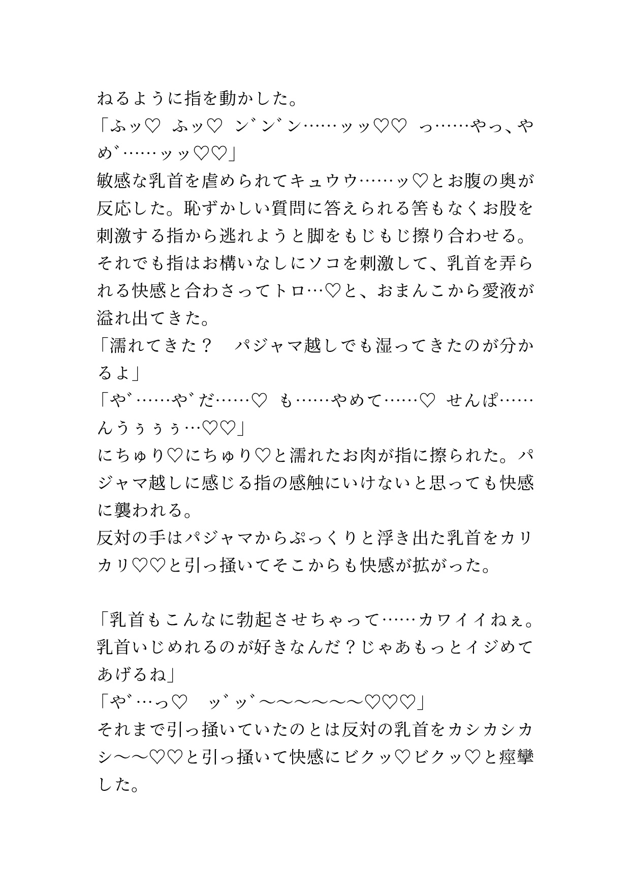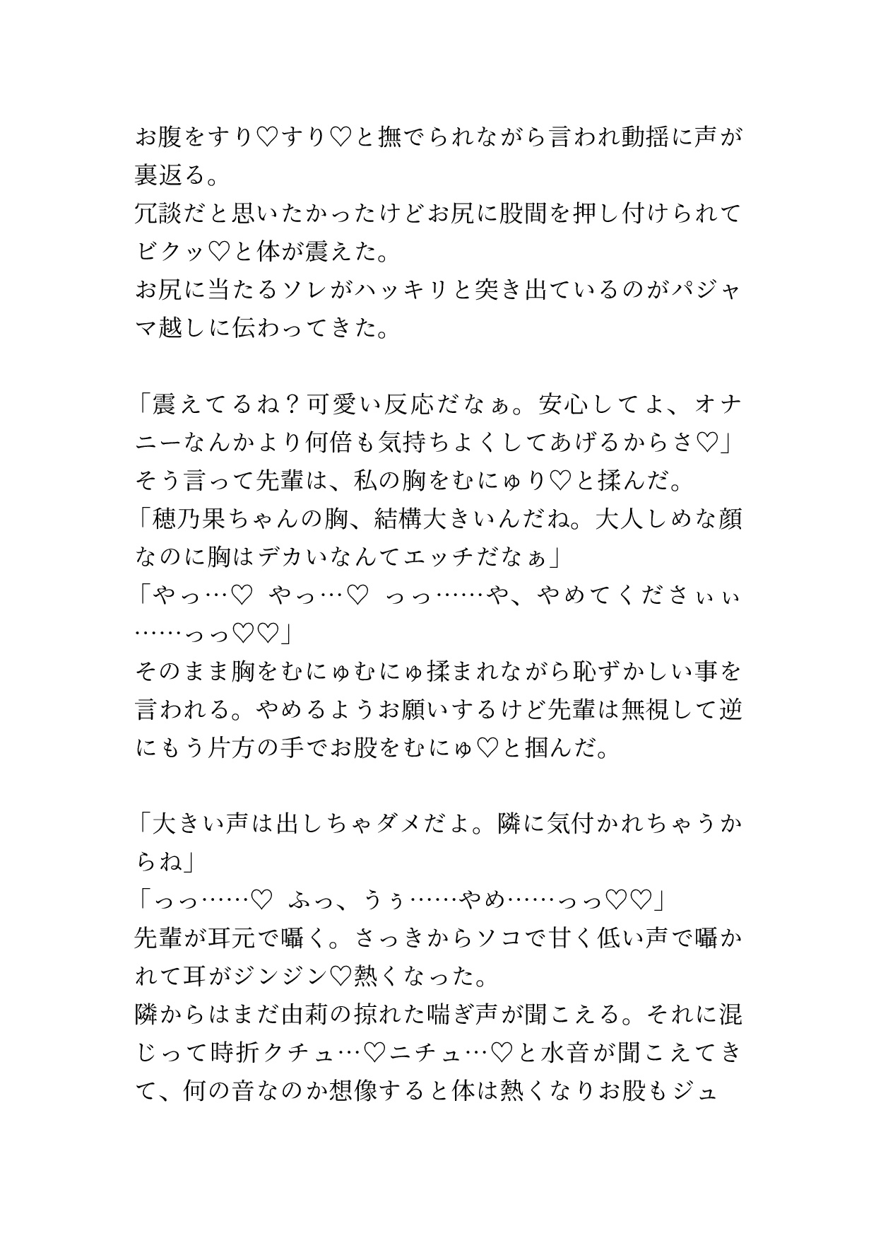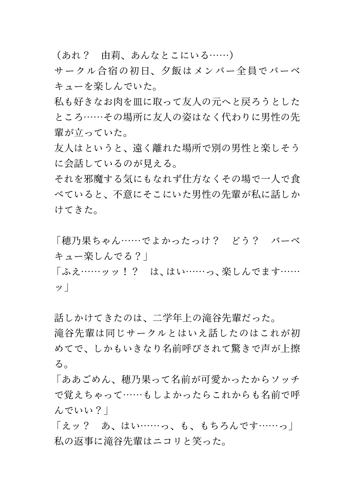 サークル合宿の夜に隣で寝てる友人が誰かとエッチしてる事に気付いて、思わずエッチな気分になってオナニーをしようとしたら、突然先輩が同じ布団の中に入ってきてそのまま沢山いやらしい事された後に、後ろから挿れられてしまう話です。