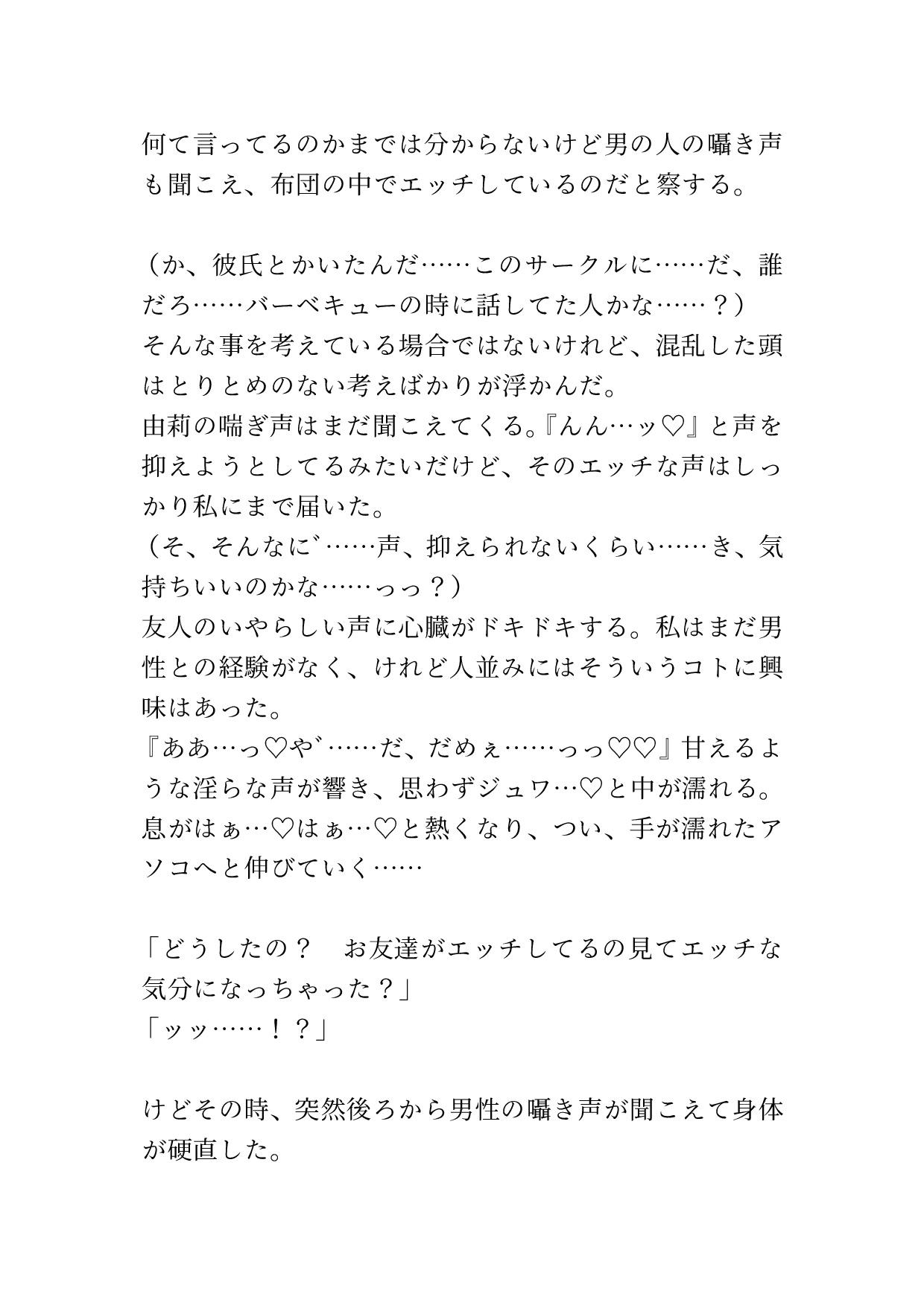 サークル合宿の夜に隣で寝てる友人が誰かとエッチしてる事に気付いて、思わずエッチな気分になってオナニーをしようとしたら、突然先輩が同じ布団の中に入ってきてそのまま後ろから挿れられてしまう話です。