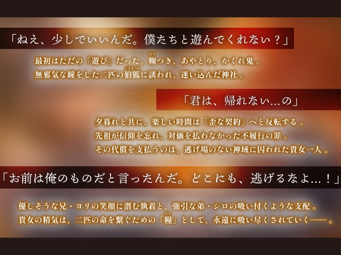 「お供え物は、貴女がいい。」かくれんぼの後に始まったのは、二匹の狐との、甘く残酷な血の契約。 優しい兄の笑顔と、強引な弟の吐息に挟まれ、貴女は次第に「日常」を忘れていく――。