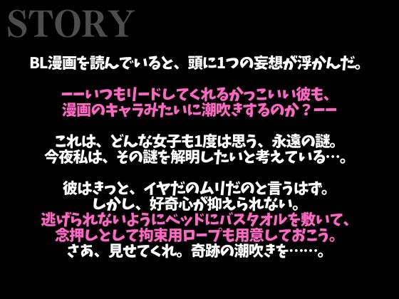 BL漫画を読んでいると、頭に1つの妄想が浮かんだ。ーーいつもリードしてくれるかっこいい彼も、漫画のキャラみたいに潮吹きするのか?ーーこれは、どんな女子も1度は思う、永遠の謎。今夜私は、その謎を解明したいと考えている…。彼はきっと、イヤだのムリだのと言うはず。しかし、好奇心が抑えられない。逃げられないようにベッドにバスタオルを敷いて、念押しとして拘束用ロープも用意しておこう。さあ、見せてくれ。奇跡の潮吹きを……。