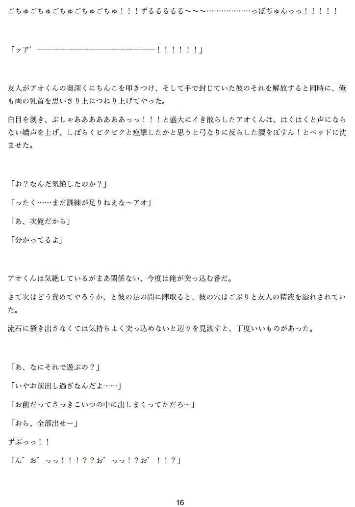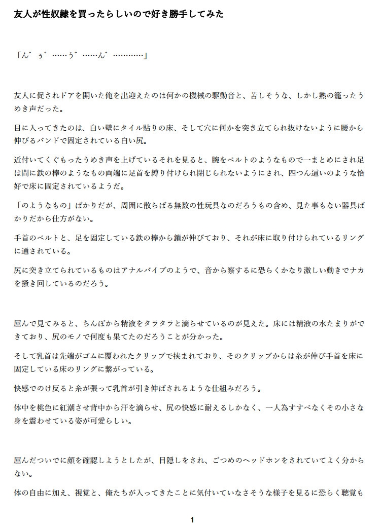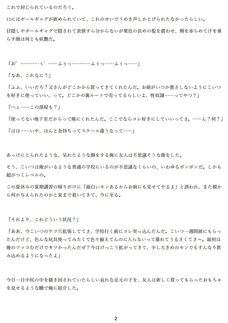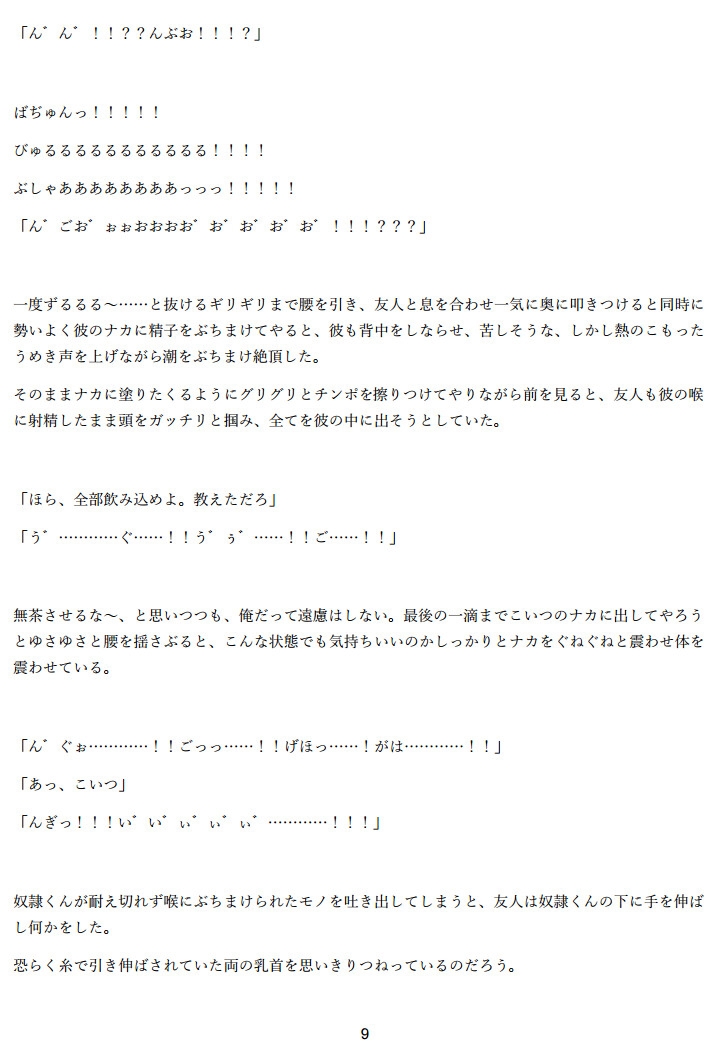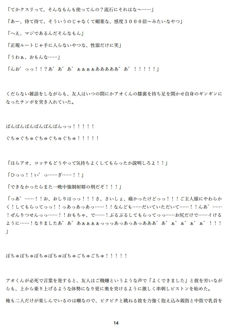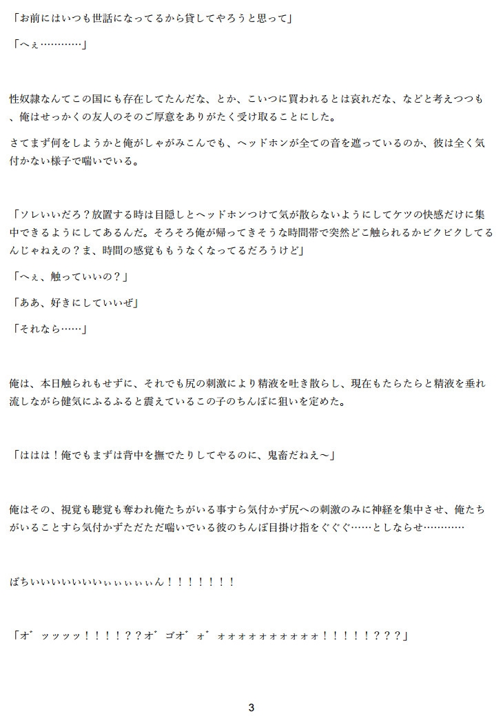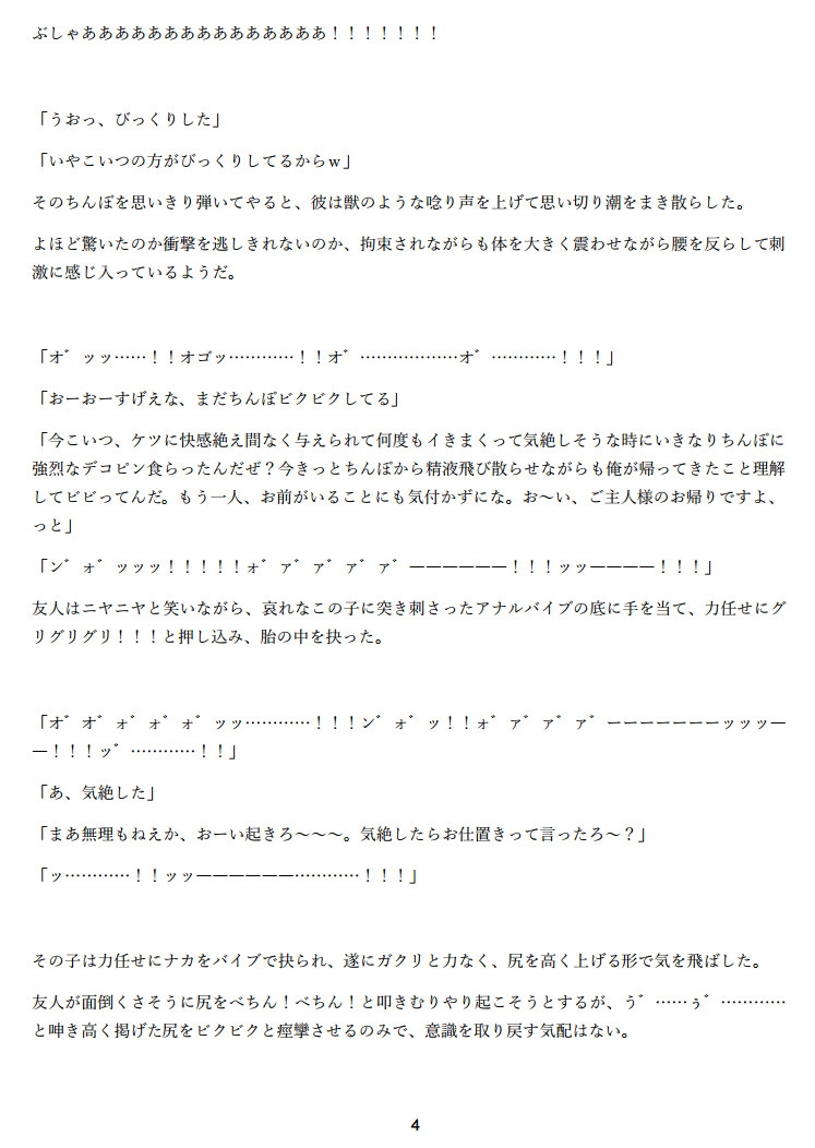 友人に呼ばれ家へ行くと、拘束されバイブを突き入れられたままの男の子がいた。最近買ってもらった性奴○らしいのでこの夏休みの間中この子を好き勝手することにしてみた。